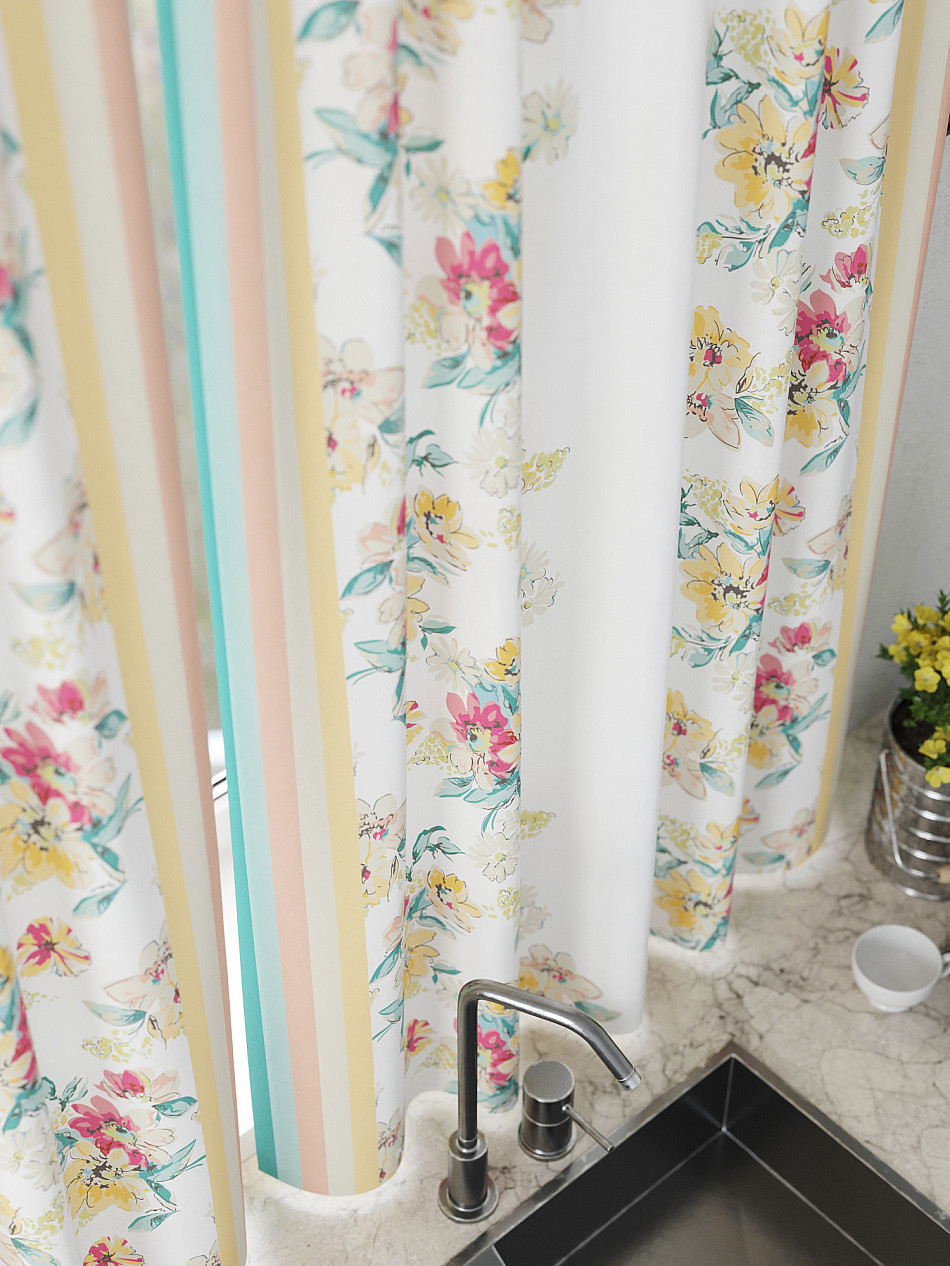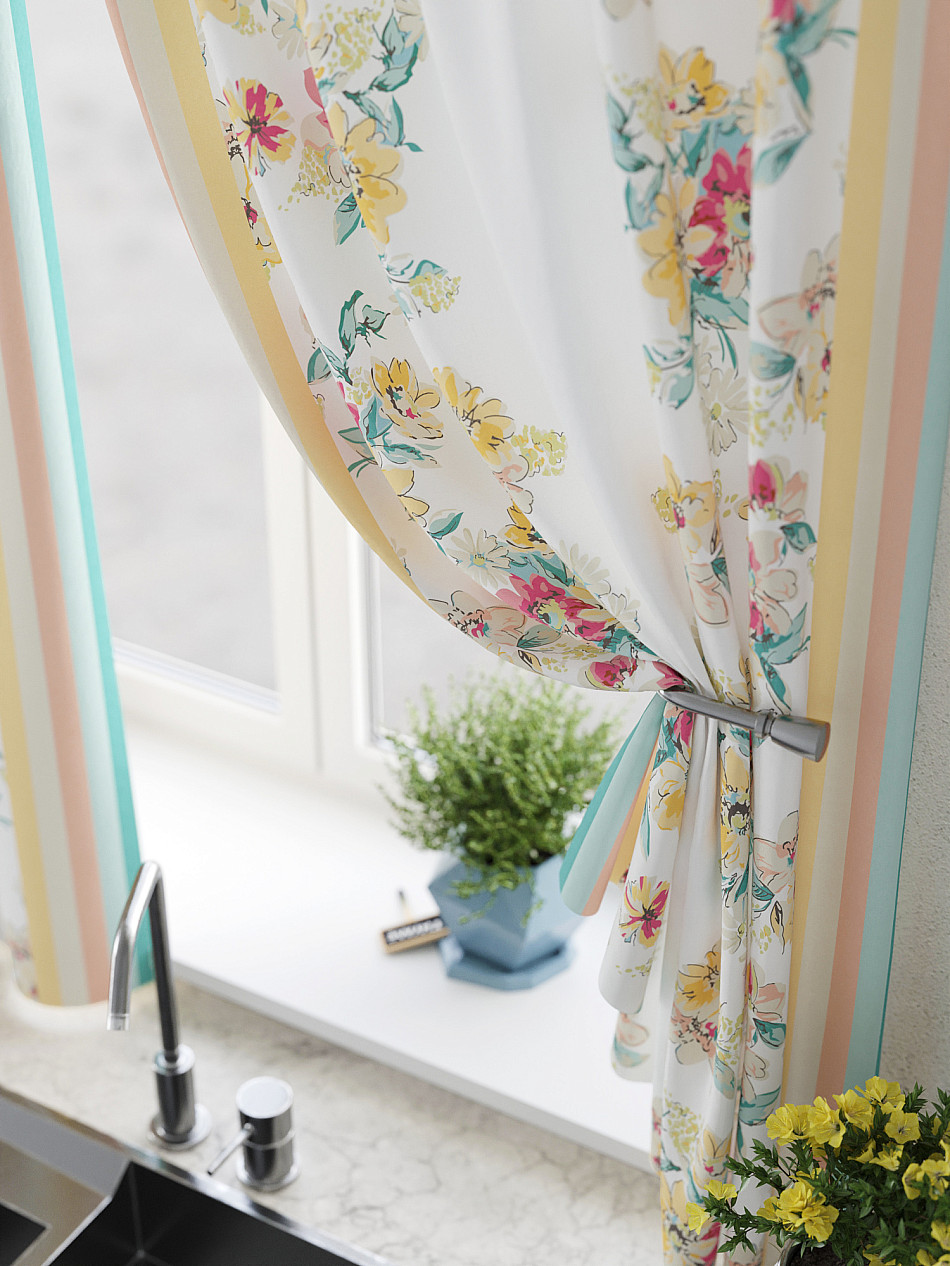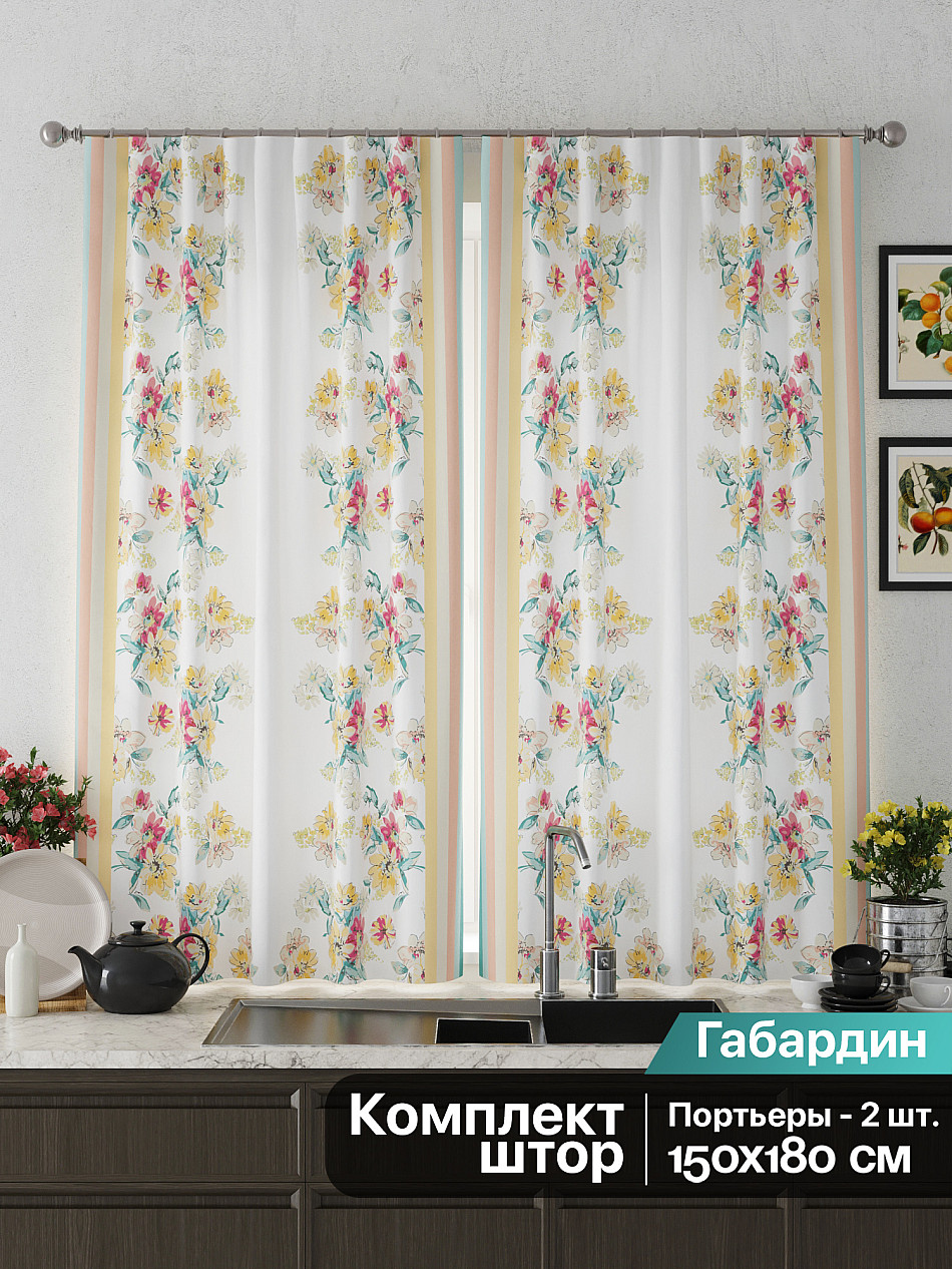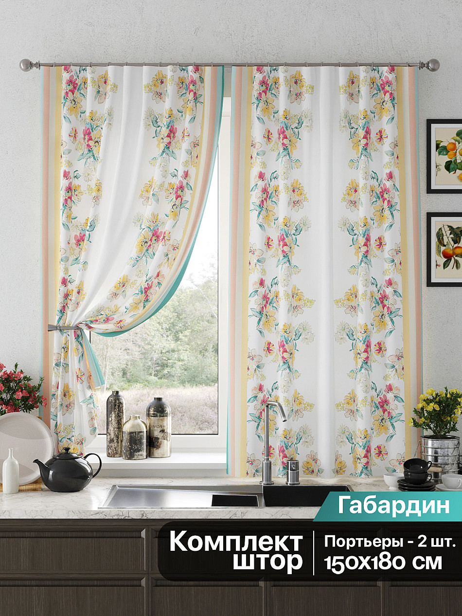 Портьеры 2 шт: Комплект штор из легкой портьерной ткани (габардин) оформлен печатным рисунком. Печатный рисунок дает широкие возможности обновить интерьер фактически нет требуя ремонта за счет огромного выбора. Ткани с печатным рисунком безопасны и не содержат токсичных веществ. Не смотря на то что, материал легкий, он имеет высокую плотность, мало загрязнятся и не требует особого ухода даже после стирки, что важно для кухонных занавесок. Шторы не выцветают, не растягиваются, превосходно драпируются, образуя струящиеся складки. Прекрасное решение для создания красоты и уюта с помощью уникальных дизайнов.