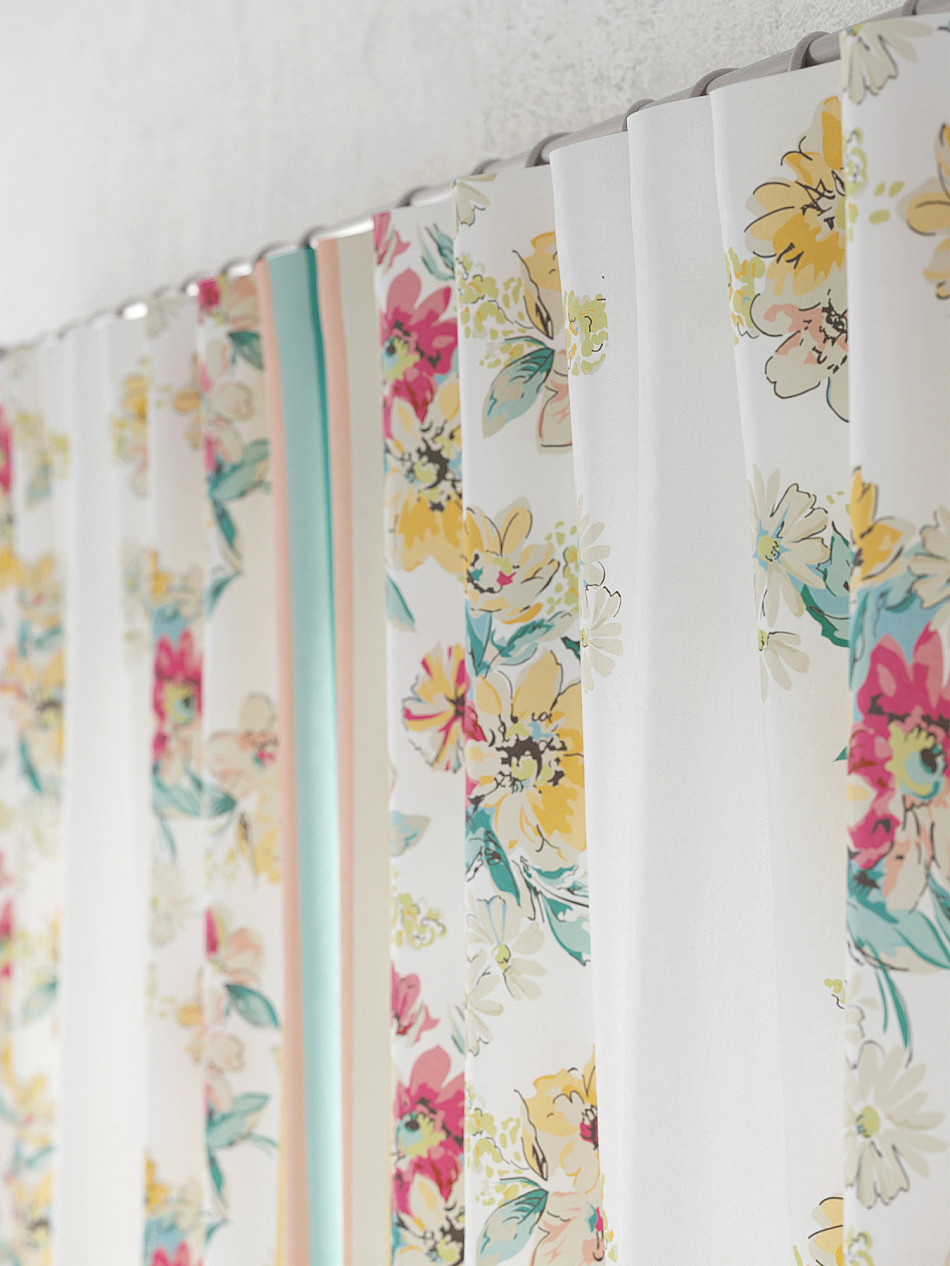 По верхнему краю портьер пришита шторная тесьма 6 см, с ее помощью затянув узелки от кордовых нитей с обеих сторон и стянув их до нужного размера можно сформировать округлые складки, далее вставить крючки в кармашки и повесить на карниз. Обязательно проверьте кордовые нити – они должны быть надежно завязаны, в противном случае во время стягивания они могут вылететь. Шторная тесьма имеет два ряда кармашков, с их помощью можно регулировать не только длину, но и ширину. Такое крепление подходит для всех типов карнизов.