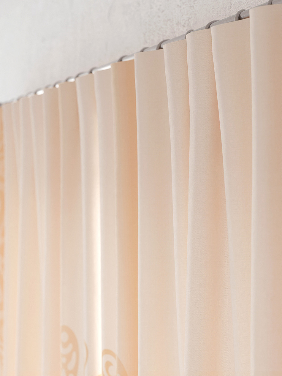 По верхнему краю портьер пришита шторная тесьма 6 см, с ее помощью затянув узелки от кордовых нитей с обеих сторон и стянув их до нужного размера можно сформировать округлые складки, далее вставить крючки в кармашки и повесить на карниз. Обязательно проверьте кордовые нити – они должны быть надежно завязаны, в противном случае во время стягивания они могут вылететь. Шторная тесьма имеет два ряда кармашков, с их помощью можно регулировать не только длину, но и ширину. Такое крепление подходит для всех типов карнизов.