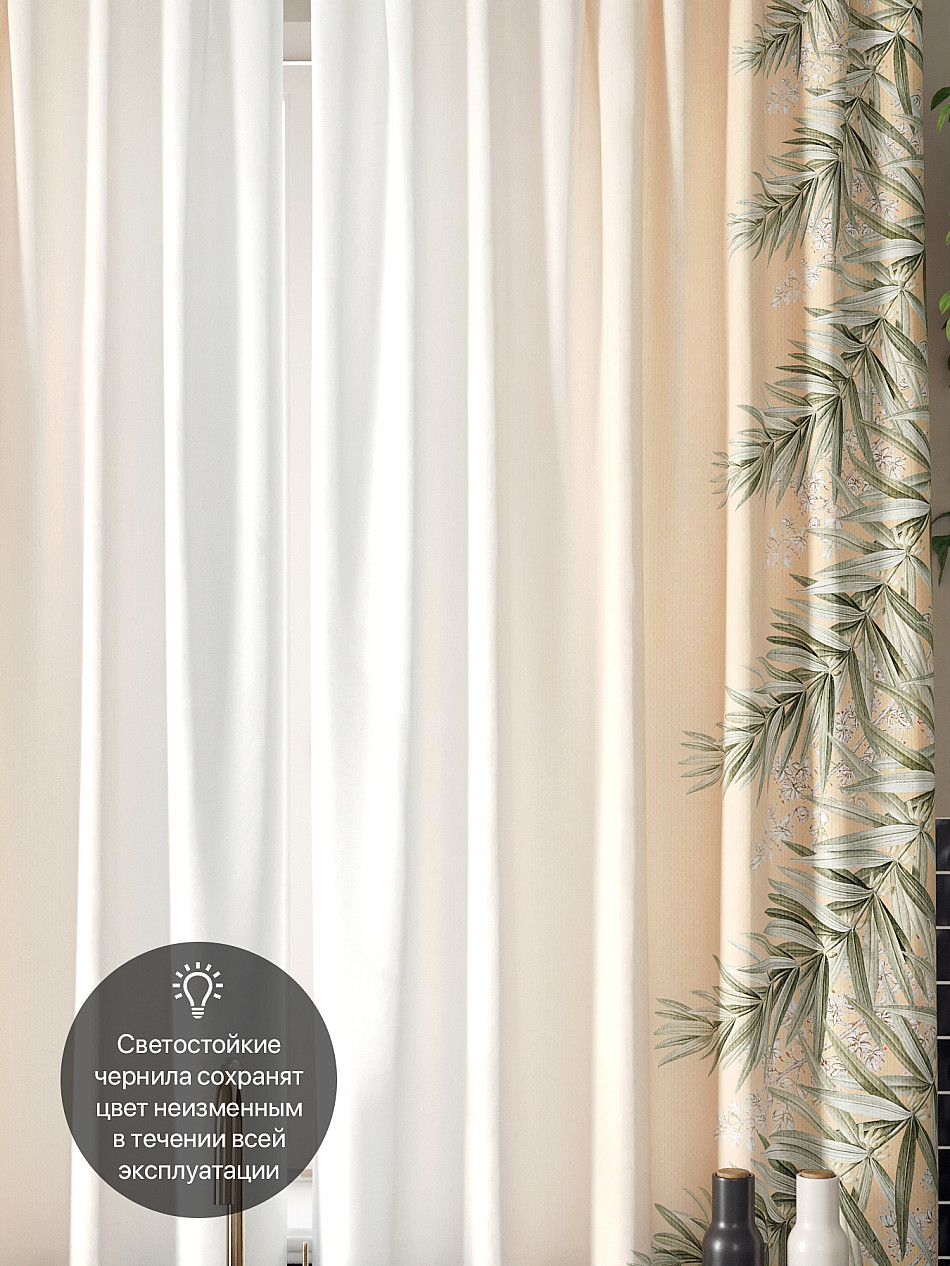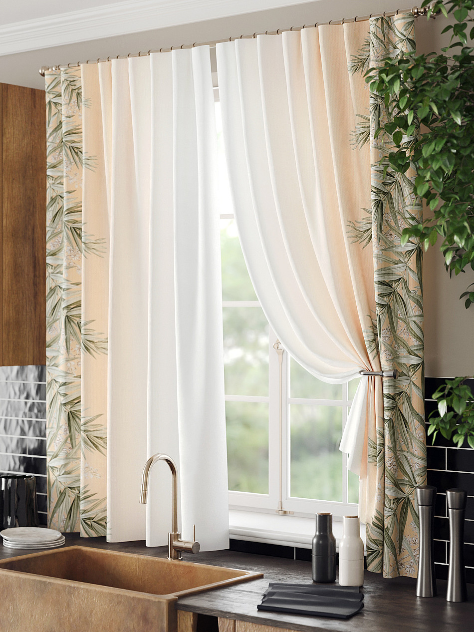 Комплект штор из легкой портьерной ткани (габардин) оформлен печатным рисунком. Печатный рисунок дает широкие возможности обновить интерьер фактически нет требуя ремонта за счет огромного выбора. Ткани с печатным рисунком безопасны и не содержат токсичных веществ. Не смотря на то что, материал легкий, он имеет высокую плотность, мало загрязнятся и не требует особого ухода даже после стирки, что важно для кухонных занавесок. Шторы не выцветают, не растягиваются, превосходно драпируются, образуя струящиеся складки. Прекрасное решение для создания красоты и уюта с помощью уникальных дизайнов.