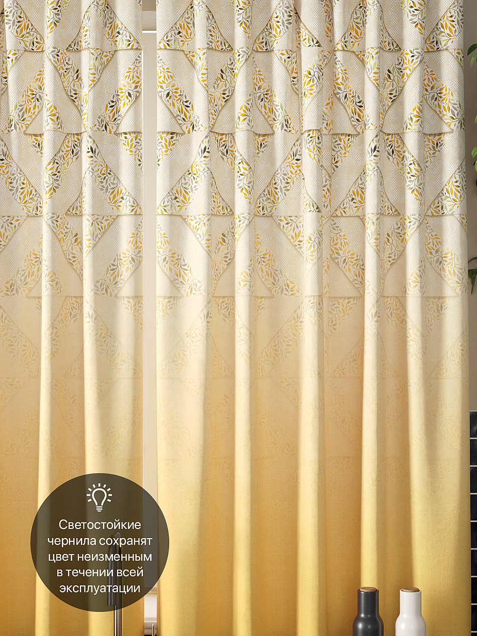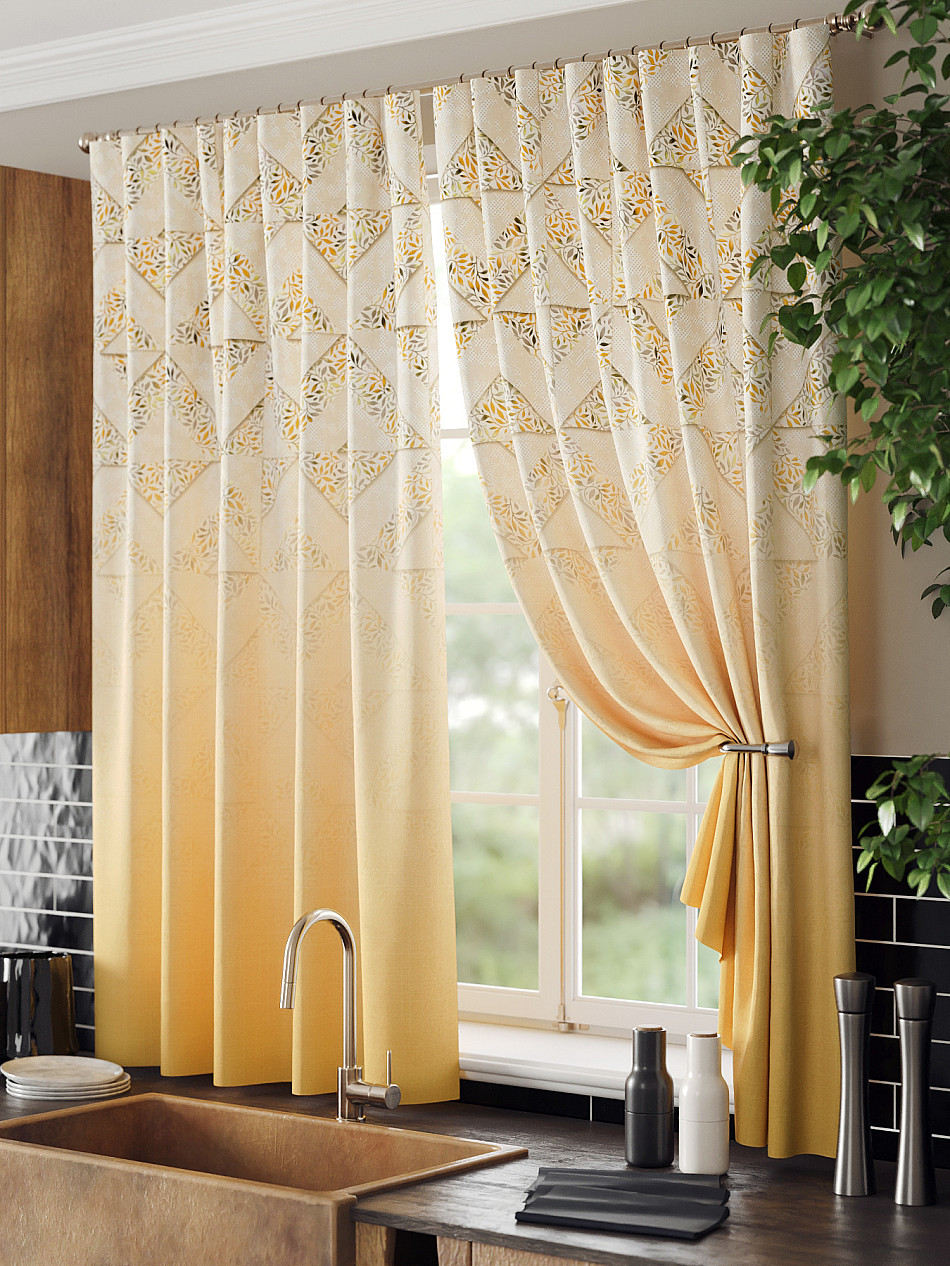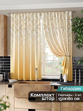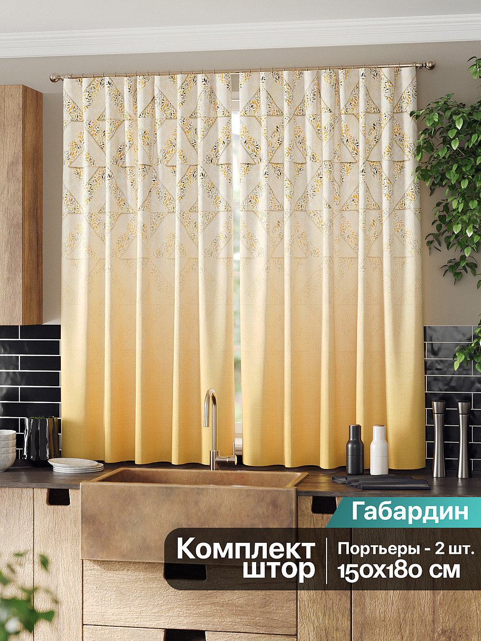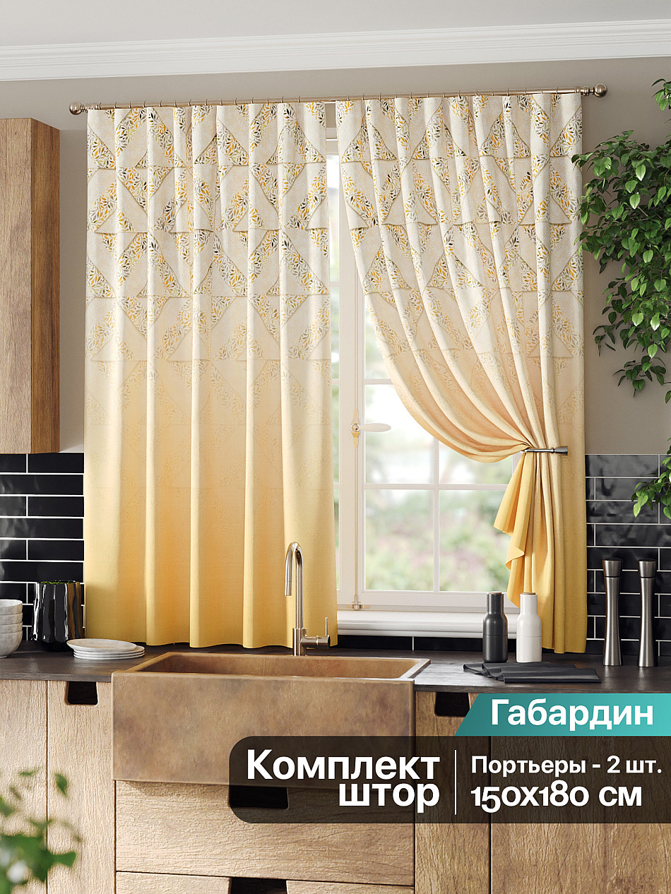 Комплект штор из легкой портьерной ткани (габардин) оформлен печатным рисунком. Печатный рисунок дает широкие возможности обновить интерьер фактически нет требуя ремонта за счет огромного выбора. Ткани с печатным рисунком безопасны и не содержат токсичных веществ. Не смотря на то что, материал легкий, он имеет высокую плотность, мало загрязнятся и не требует особого ухода даже после стирки, что важно для кухонных занавесок. Шторы не выцветают, не растягиваются, превосходно драпируются, образуя струящиеся складки. Прекрасное решение для создания красоты и уюта с помощью уникальных дизайнов.