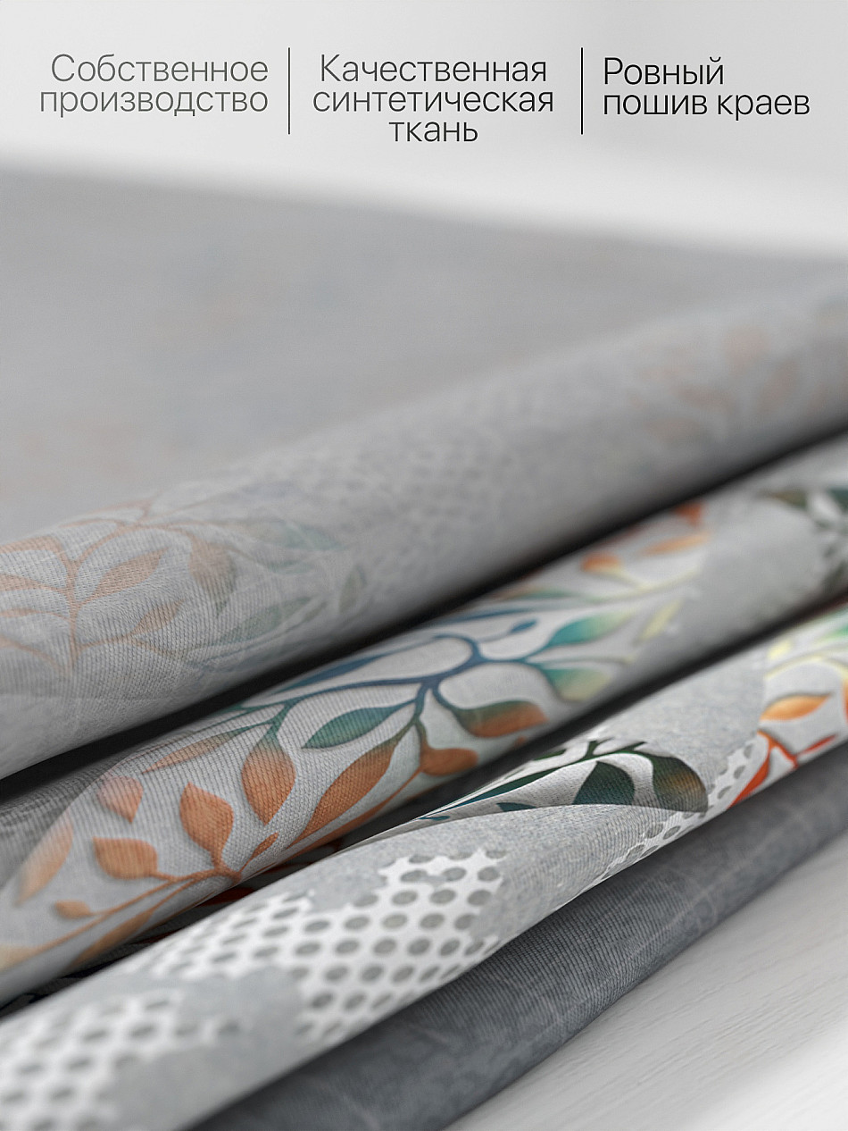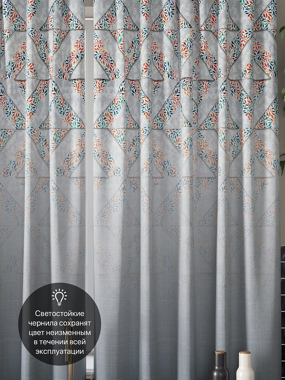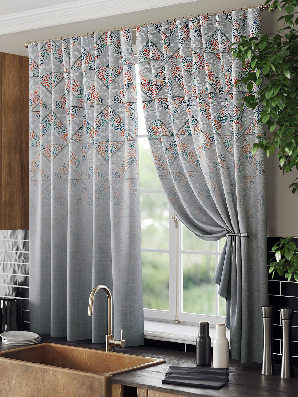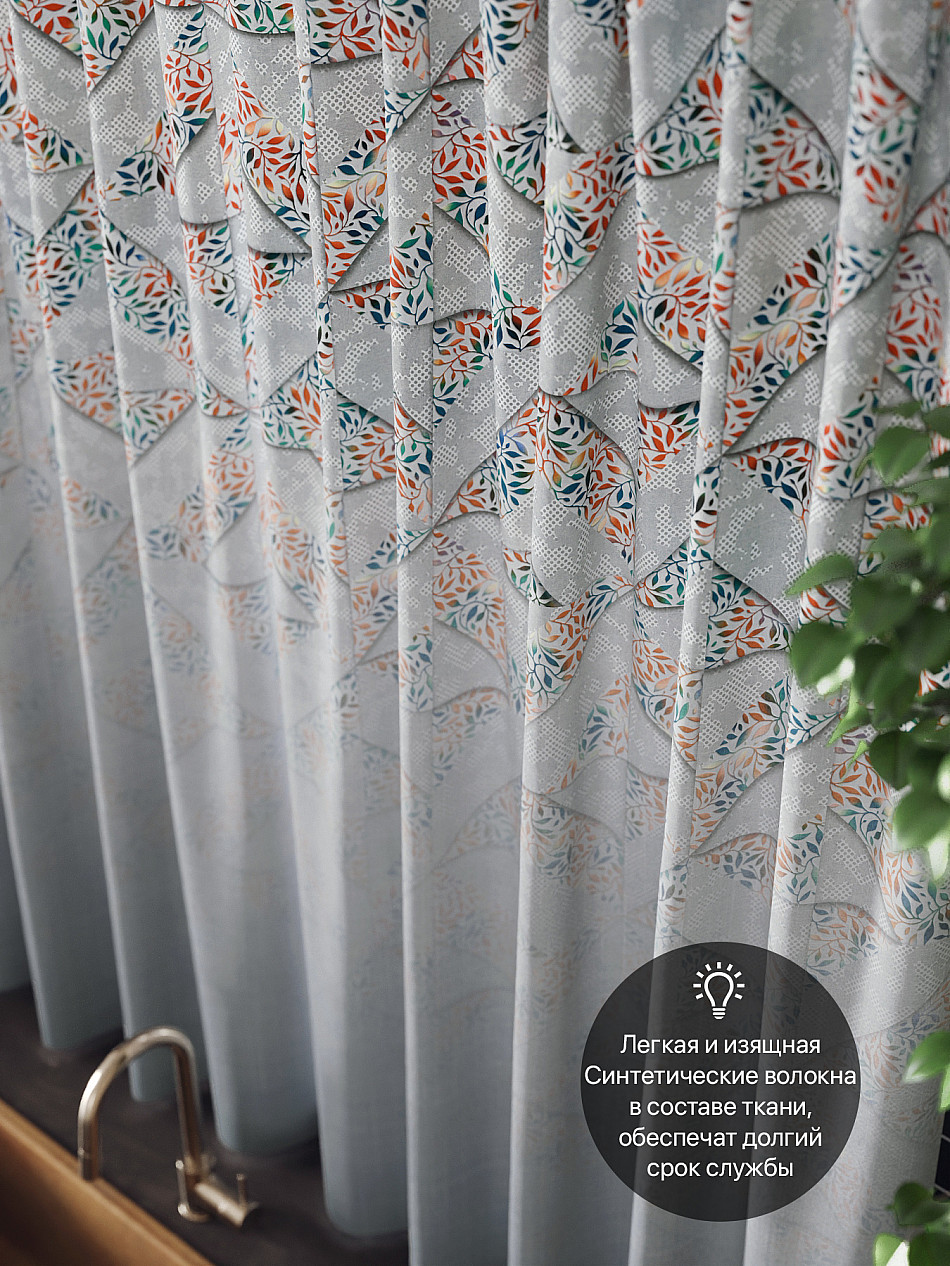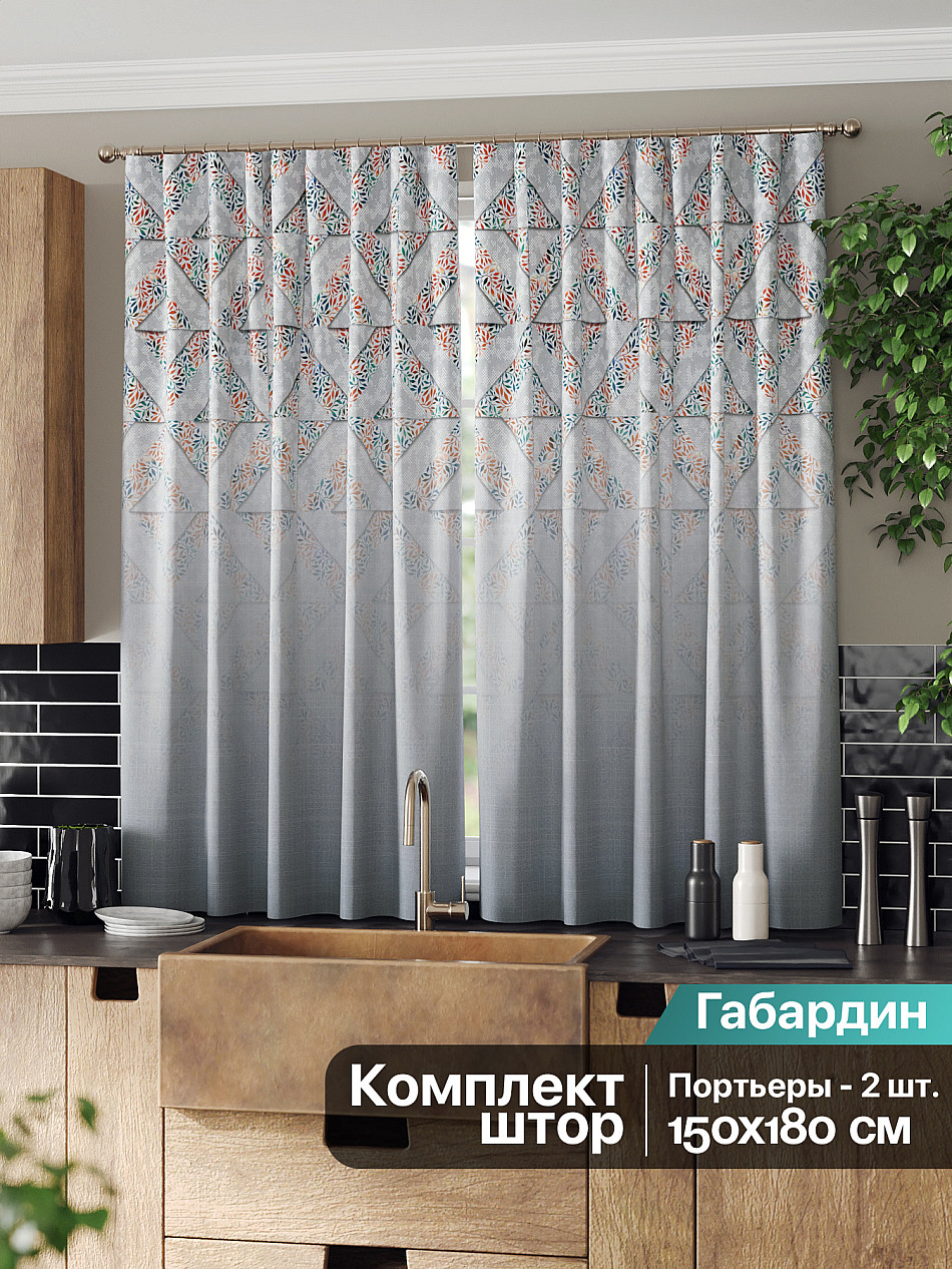 Комплект штор из легкой портьерной ткани (габардин) оформлен печатным рисунком. Печатный рисунок дает широкие возможности обновить интерьер фактически нет требуя ремонта за счет огромного выбора. Ткани с печатным рисунком безопасны и не содержат токсичных веществ. Не смотря на то что, материал легкий, он имеет высокую плотность, мало загрязнятся и не требует особого ухода даже после стирки, что важно для кухонных занавесок. Шторы не выцветают, не растягиваются, превосходно драпируются, образуя струящиеся складки. Прекрасное решение для создания красоты и уюта с помощью уникальных дизайнов.