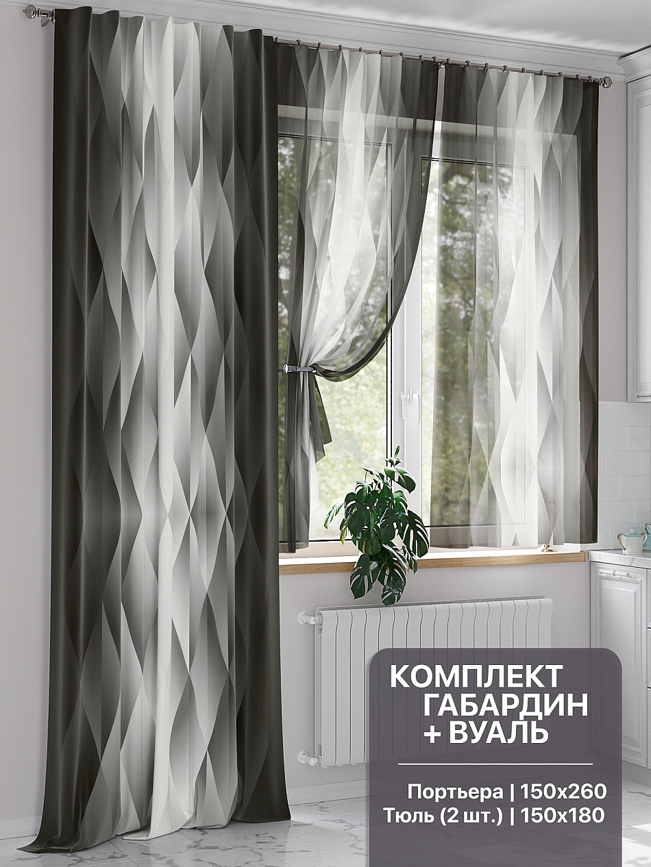 - Состав комплекта Портьера 150х260 см. — 1 шт., вуаль 150х180 см — 2 шт.