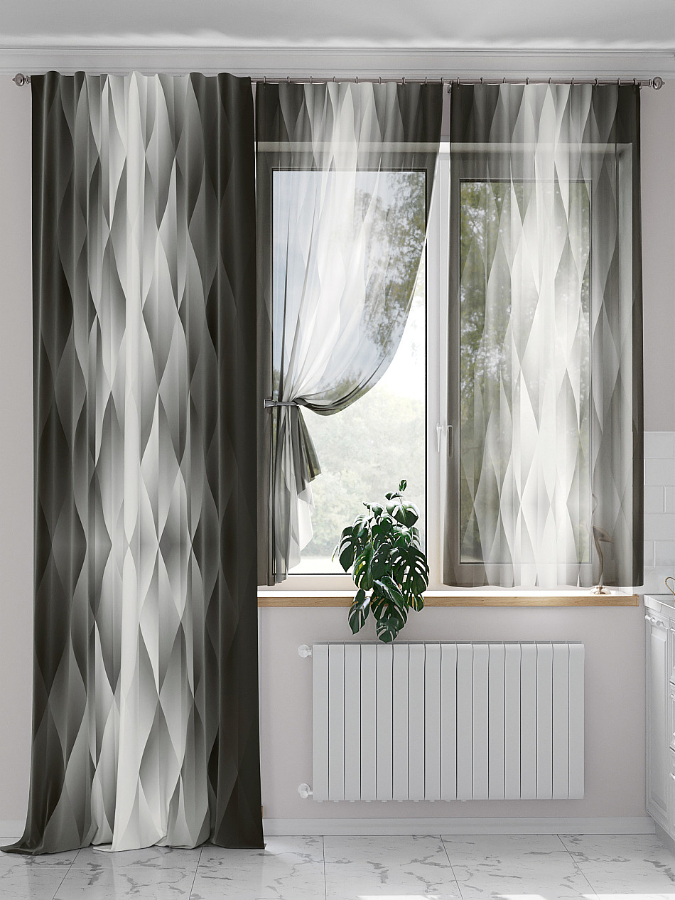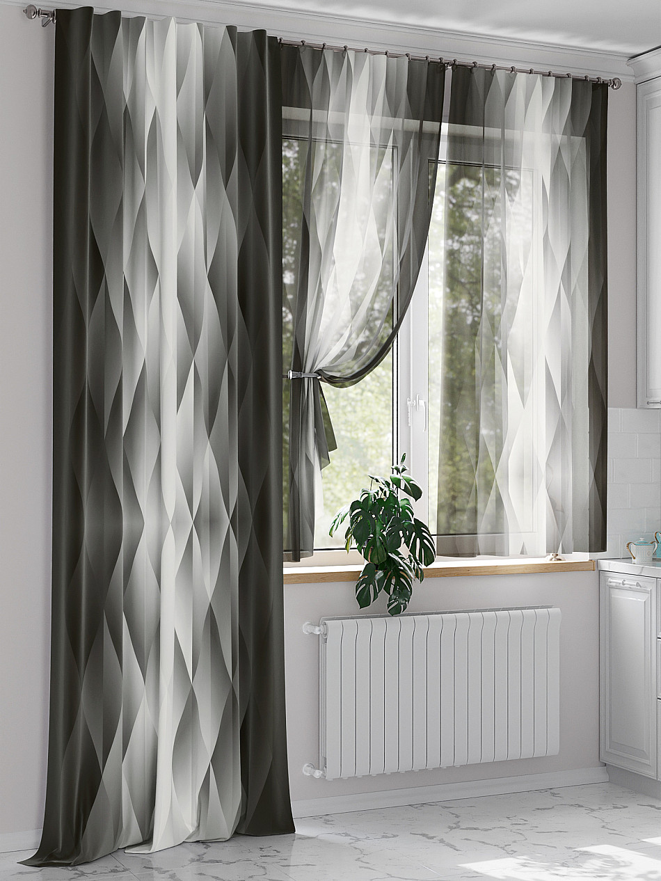 Тюль 2 шт.: Легкая основа (вуаль) оформлена геометрическим рисунком. Ширина — 150 см., высота — 180 см., крепление — шторная лента (крючки).