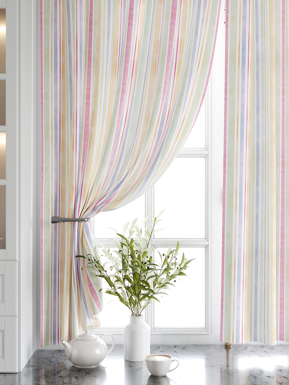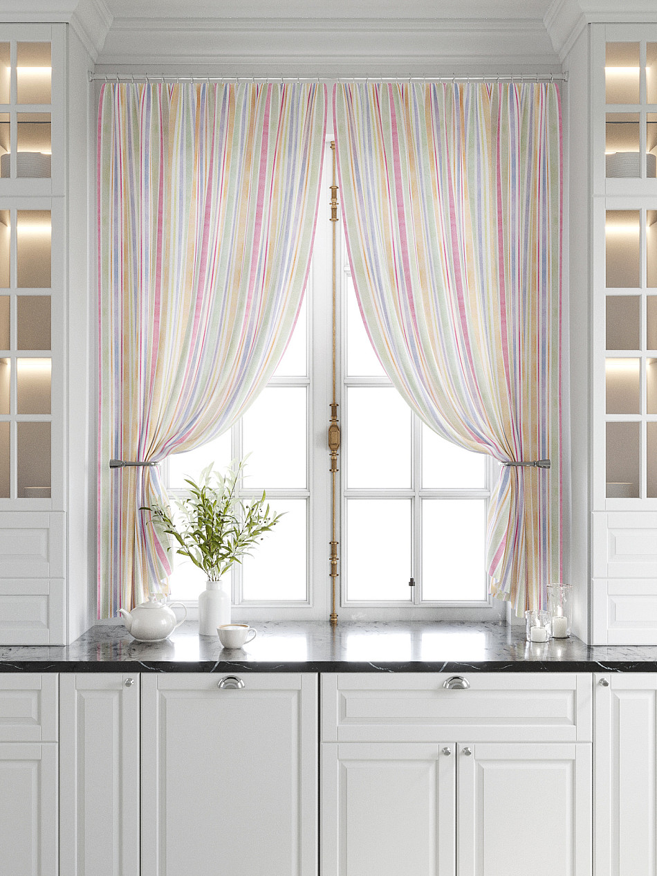 Комплект штор из легкой портьерной ткани (габардин) оформлен печатным рисунком. Печатный рисунок дает широкие возможности обновить интерьер фактически нет требуя ремонта за счет огромного выбора. Ткани с печатным рисунком безопасны и не содержат токсичных веществ. Не смотря на то что, материал легкий, он имеет высокую плотность, мало загрязнятся и не требует особого ухода даже после стирки, что важно для кухонных занавесок. Шторы не выцветают, не растягиваются, превосходно драпируются, образуя струящиеся складки. Прекрасное решение для создания красоты и уюта с помощью уникальных дизайнов.