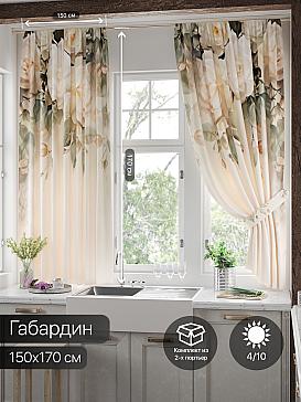 Комплект штор из легкой портьерной ткани (габардин) оформлен печатным рисунком. Печатный рисунок дает широкие возможности обновить интерьер фактически нет требуя ремонта за счет огромного выбора. Ткани с печатным рисунком безопасны и не содержат токсичных веществ. Не смотря на то что, материал легкий, он имеет высокую плотность, мало загрязнятся и не требует особого ухода даже после стирки, что важно для кухонных занавесок. Шторы не выцветают, не растягиваются, превосходно драпируются, образуя струящиеся складки. Прекрасное решение для создания красоты и уюта с помощью уникальных дизайнов.