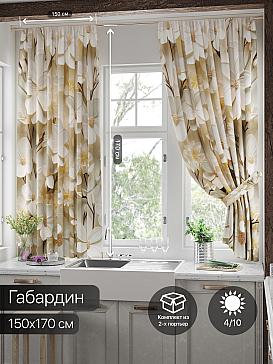 Комплект штор из легкой портьерной ткани (габардин) оформлен печатным рисунком. Печатный рисунок дает широкие возможности обновить интерьер фактически нет требуя ремонта за счет огромного выбора. Ткани с печатным рисунком безопасны и не содержат токсичных веществ. Не смотря на то что, материал легкий, он имеет высокую плотность, мало загрязнятся и не требует особого ухода даже после стирки, что важно для кухонных занавесок. Шторы не выцветают, не растягиваются, превосходно драпируются, образуя струящиеся складки. Прекрасное решение для создания красоты и уюта с помощью уникальных дизайнов.