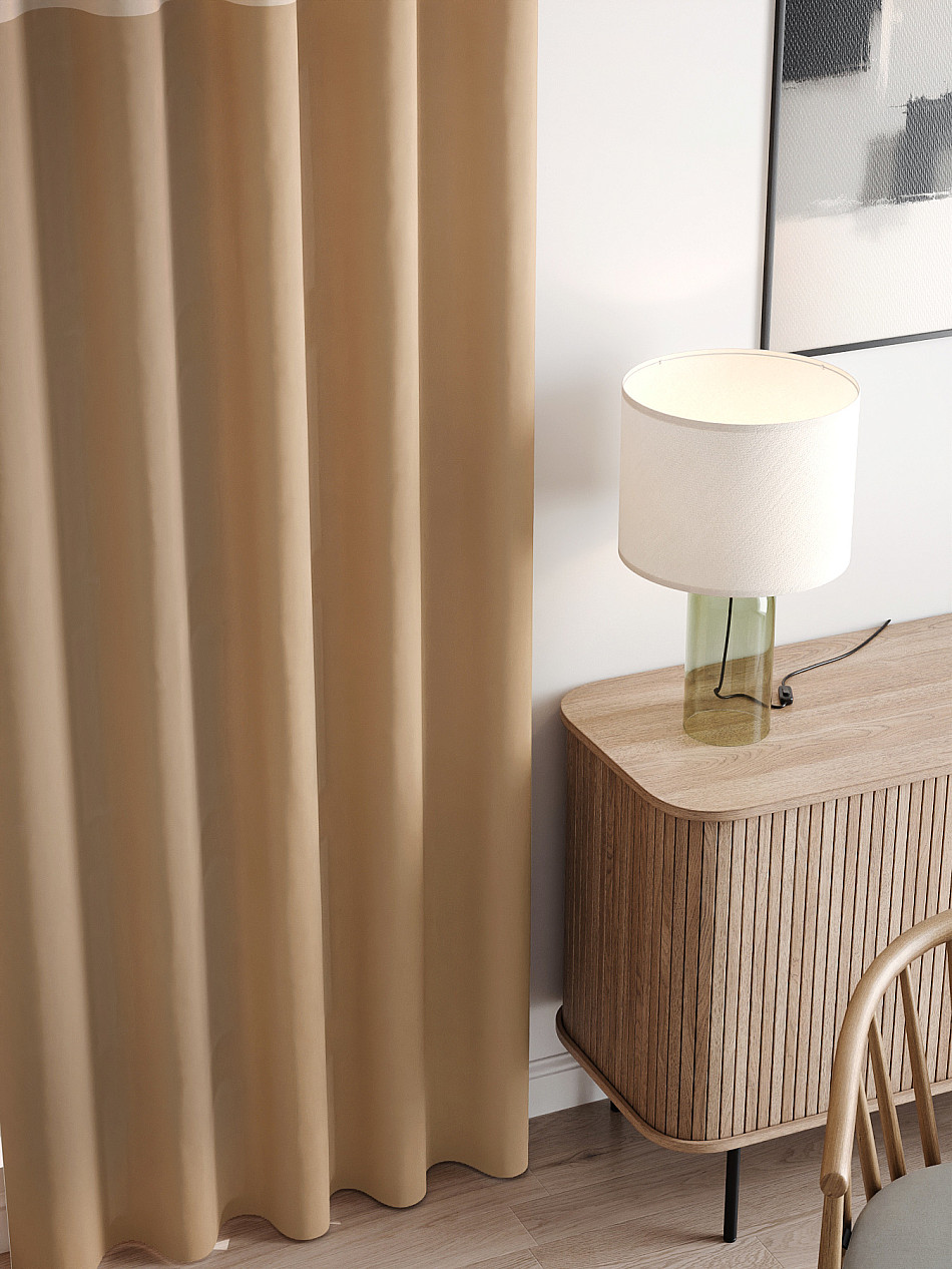 По верхнему краю портьеры пришита шторная тесьма 6 см, с ее помощью затянув узелки от кордовых нитей с обеих сторон и стянув их до нужного размера можно сформировать округлые складки, далее вставить крючки в кармашки и повесить на карниз. Обязательно проверьте кордовые нити – они должны быть надежно завязаны, в противном случае во время стягивания они могут вылететь. Шторная тесьма имеет два ряда кармашков, с их помощью можно регулировать не только длину, но и ширину. Такое крепление подходит для всех типов карнизов.