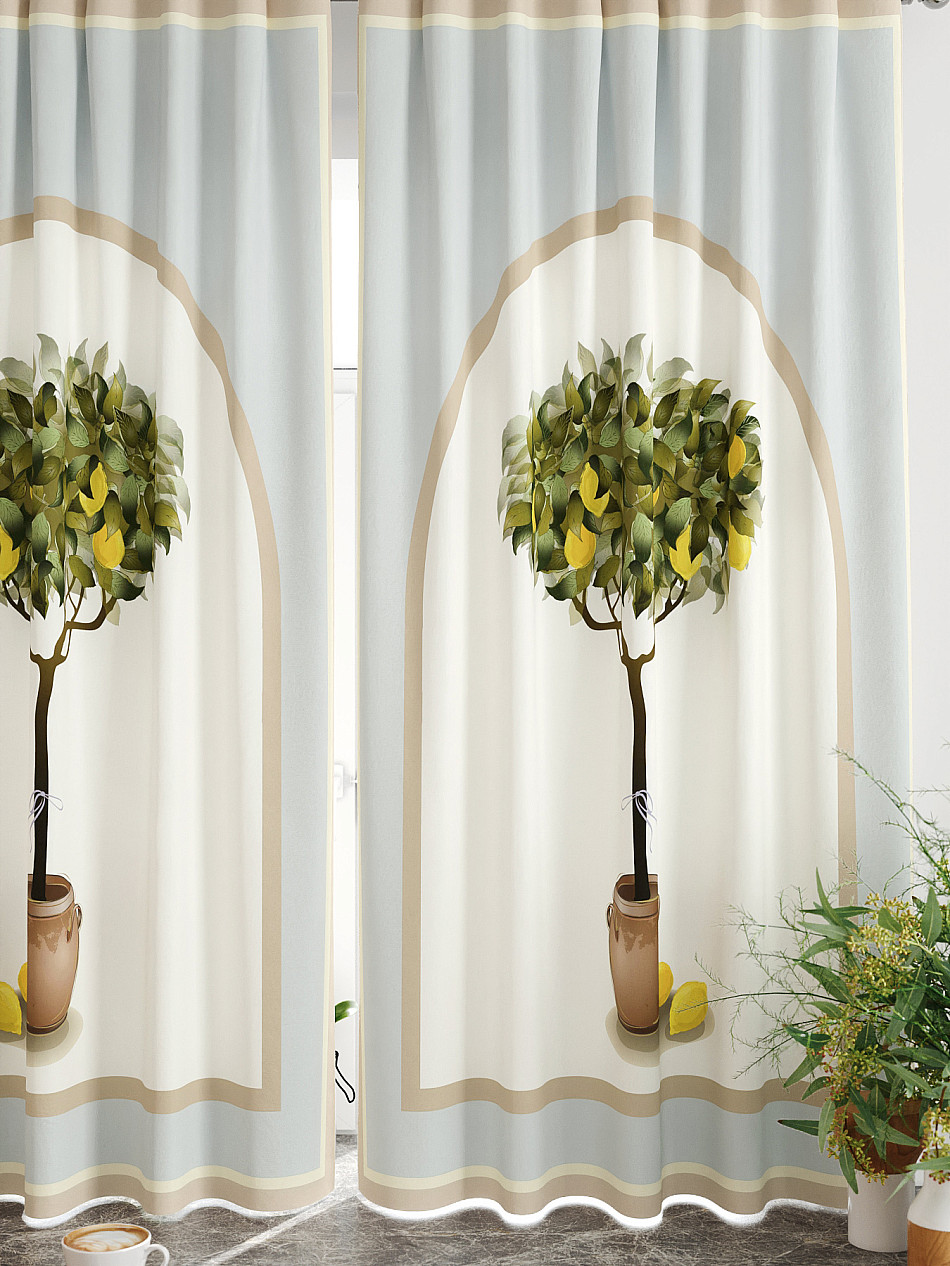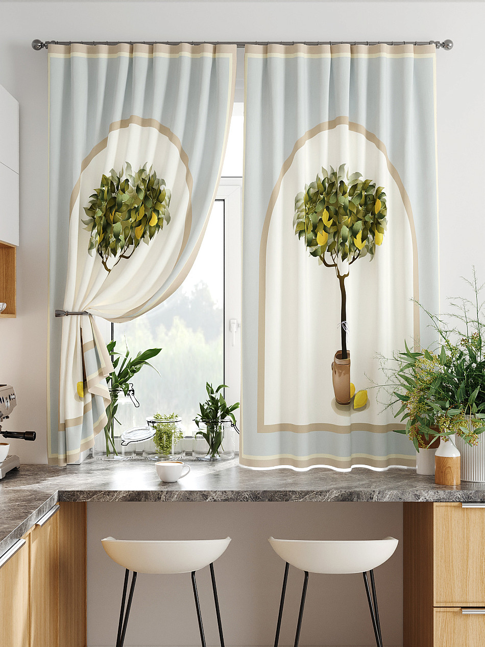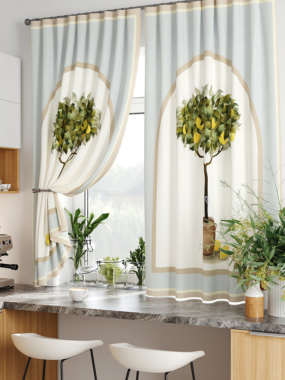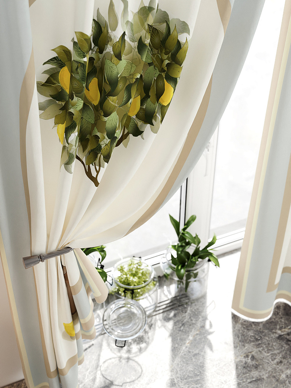 Комплект штор из легкой портьерной ткани (габардин) оформлен печатным рисунком. Печатный рисунок дает широкие возможности обновить интерьер фактически нет требуя ремонта за счет огромного выбора. Ткани с печатным рисунком безопасны и не содержат токсичных веществ. Не смотря на то что, материал легкий, он имеет высокую плотность, мало загрязнятся и не требует особого ухода даже после стирки, что важно для кухонных занавесок. Шторы не выцветают, не растягиваются, превосходно драпируются, образуя струящиеся складки. Прекрасное решение для создания красоты и уюта с помощью уникальных дизайнов.