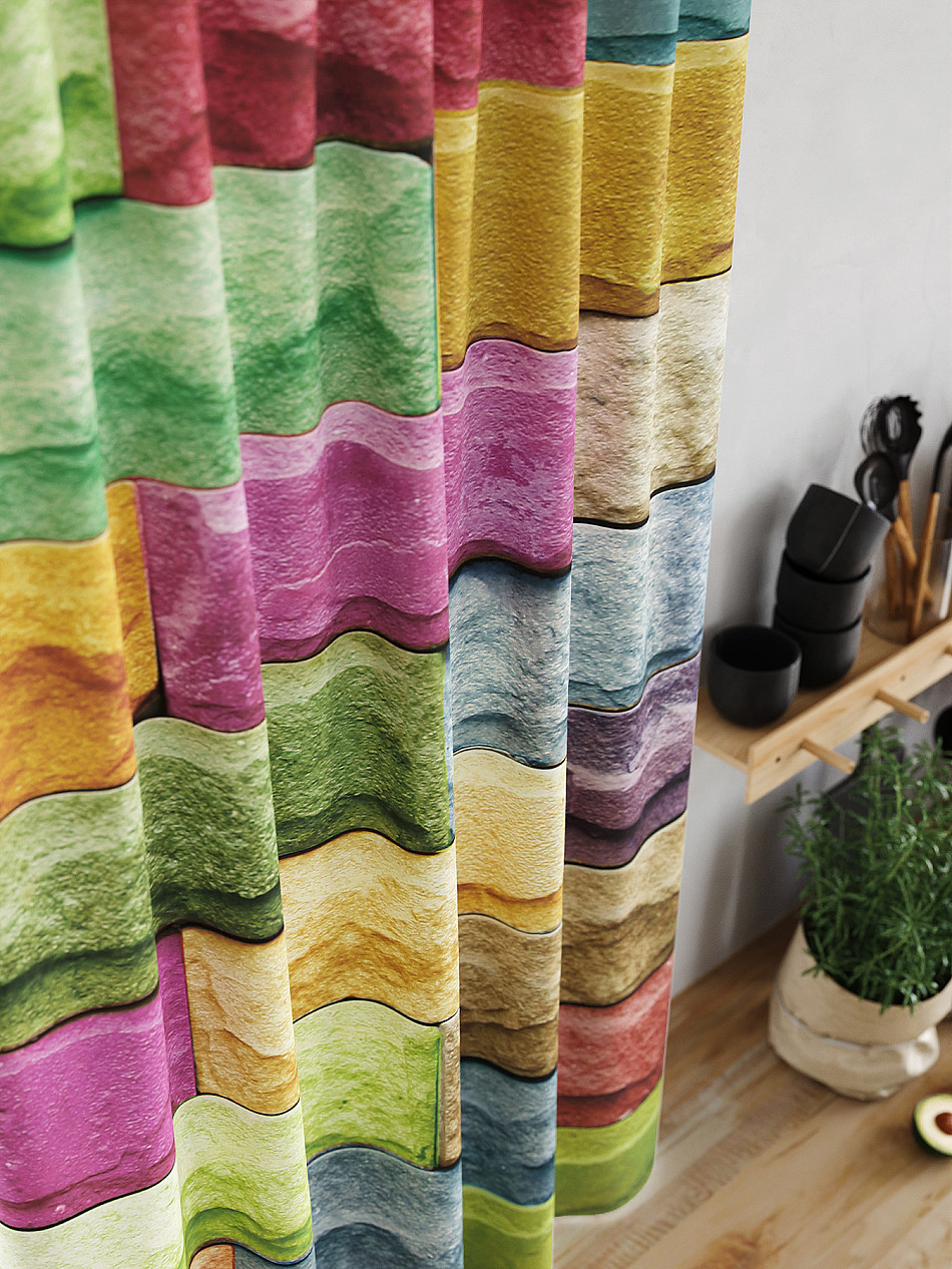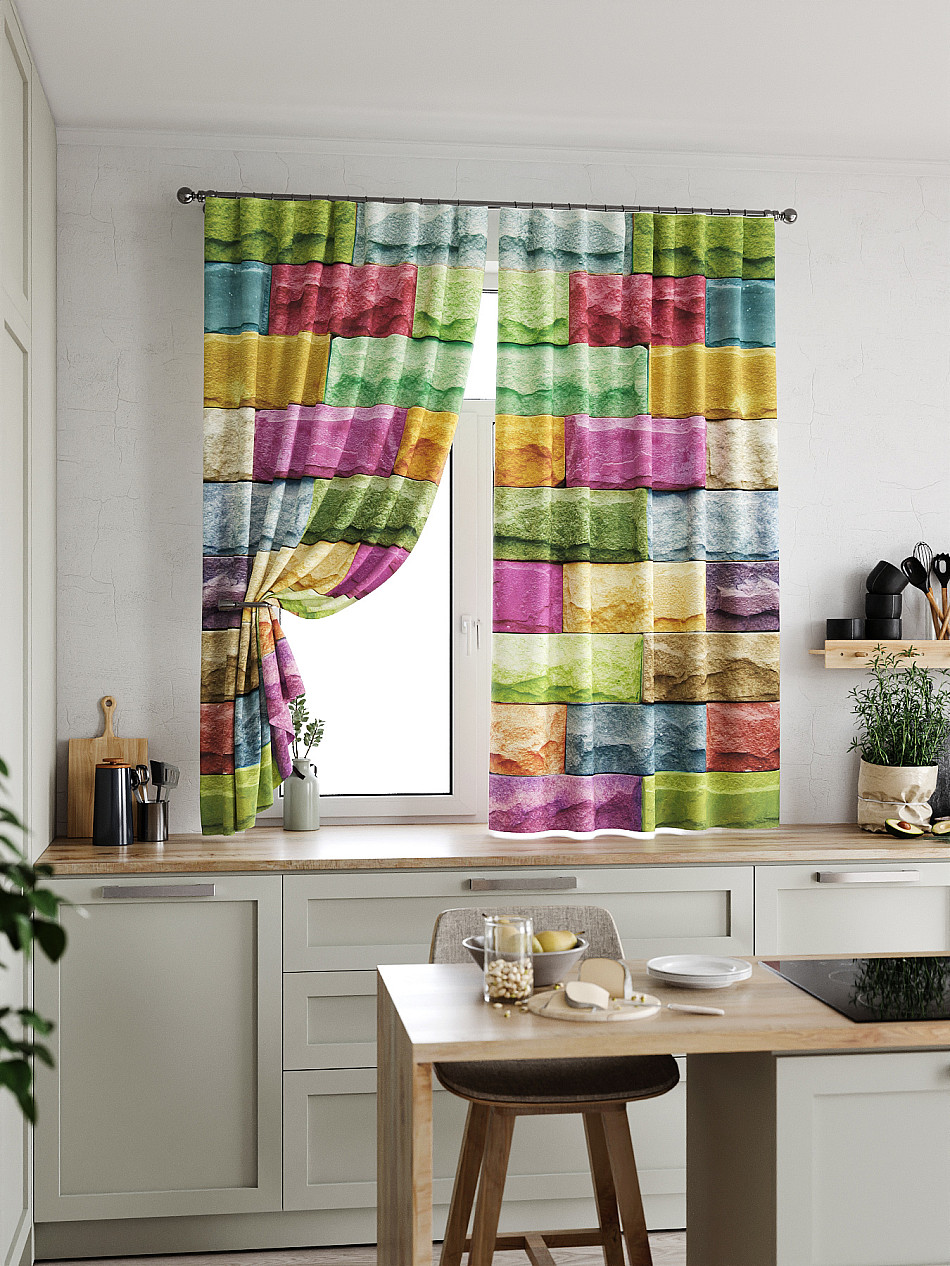 Комплект штор из легкой портьерной ткани (габардин) оформлен печатным рисунком. Печатный рисунок дает широкие возможности обновить интерьер фактически нет требуя ремонта за счет огромного выбора. Ткани с печатным рисунком безопасны и не содержат токсичных веществ. Не смотря на то что, материал легкий, он имеет высокую плотность, мало загрязнятся и не требует особого ухода даже после стирки, что важно для кухонных занавесок. Шторы не выцветают, не растягиваются, превосходно драпируются, образуя струящиеся складки. Прекрасное решение для создания красоты и уюта с помощью уникальных дизайнов.