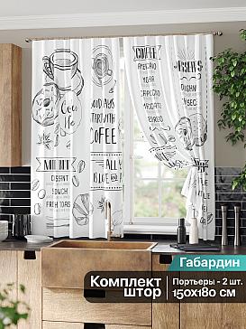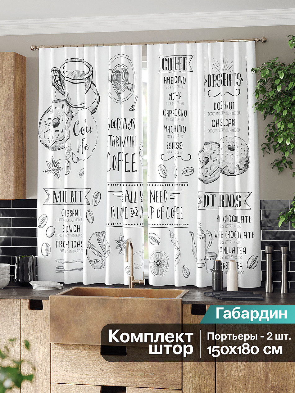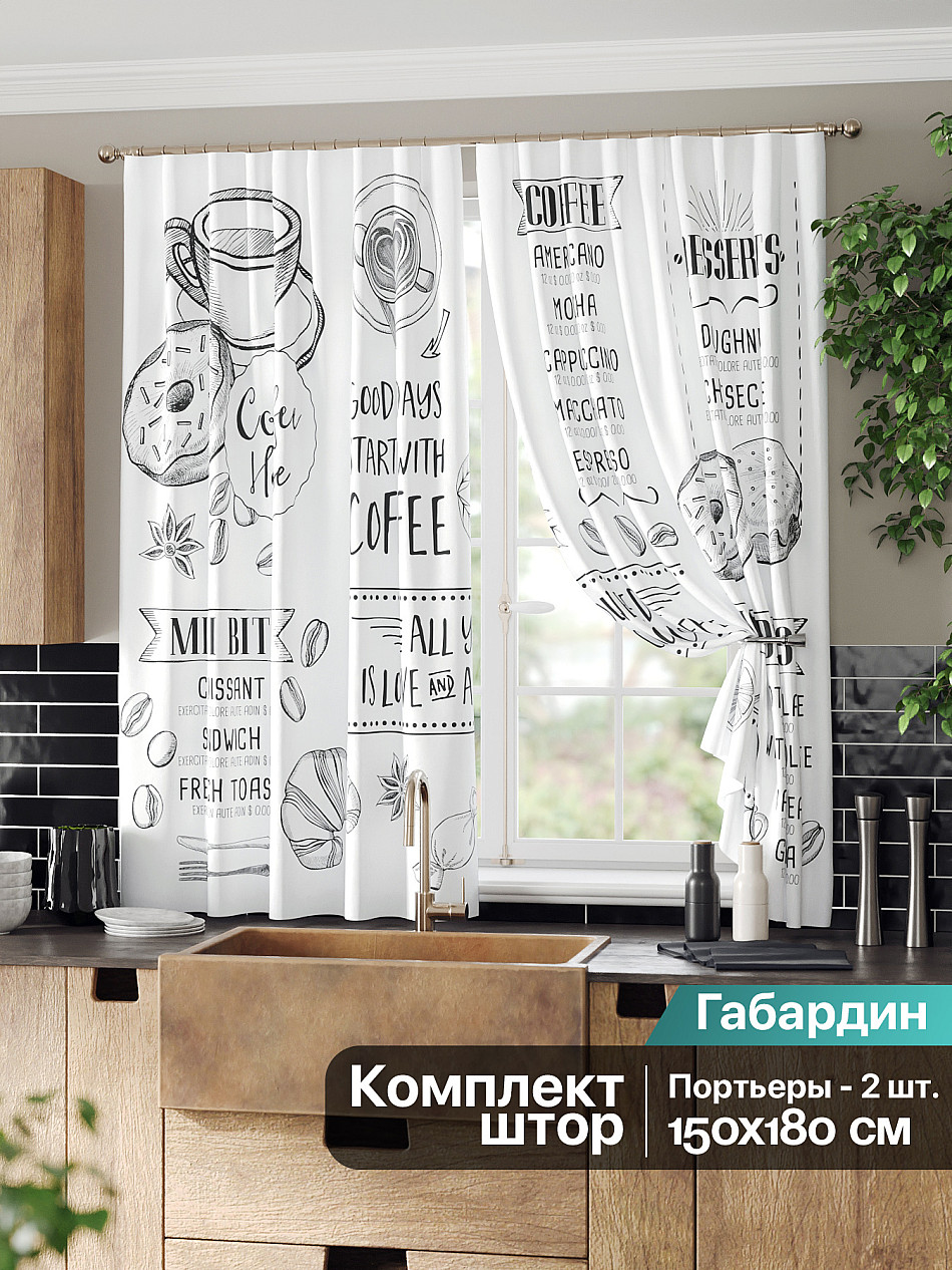 Комплект штор из легкой портьерной ткани (габардин) оформлен печатным рисунком. Печатный рисунок дает широкие возможности обновить интерьер фактически нет требуя ремонта за счет огромного выбора. Ткани с печатным рисунком безопасны и не содержат токсичных веществ. Не смотря на то что, материал легкий, он имеет высокую плотность, мало загрязнятся и не требует особого ухода даже после стирки, что важно для кухонных занавесок. Шторы не выцветают, не растягиваются, превосходно драпируются, образуя струящиеся складки. Прекрасное решение для создания красоты и уюта с помощью уникальных дизайнов.