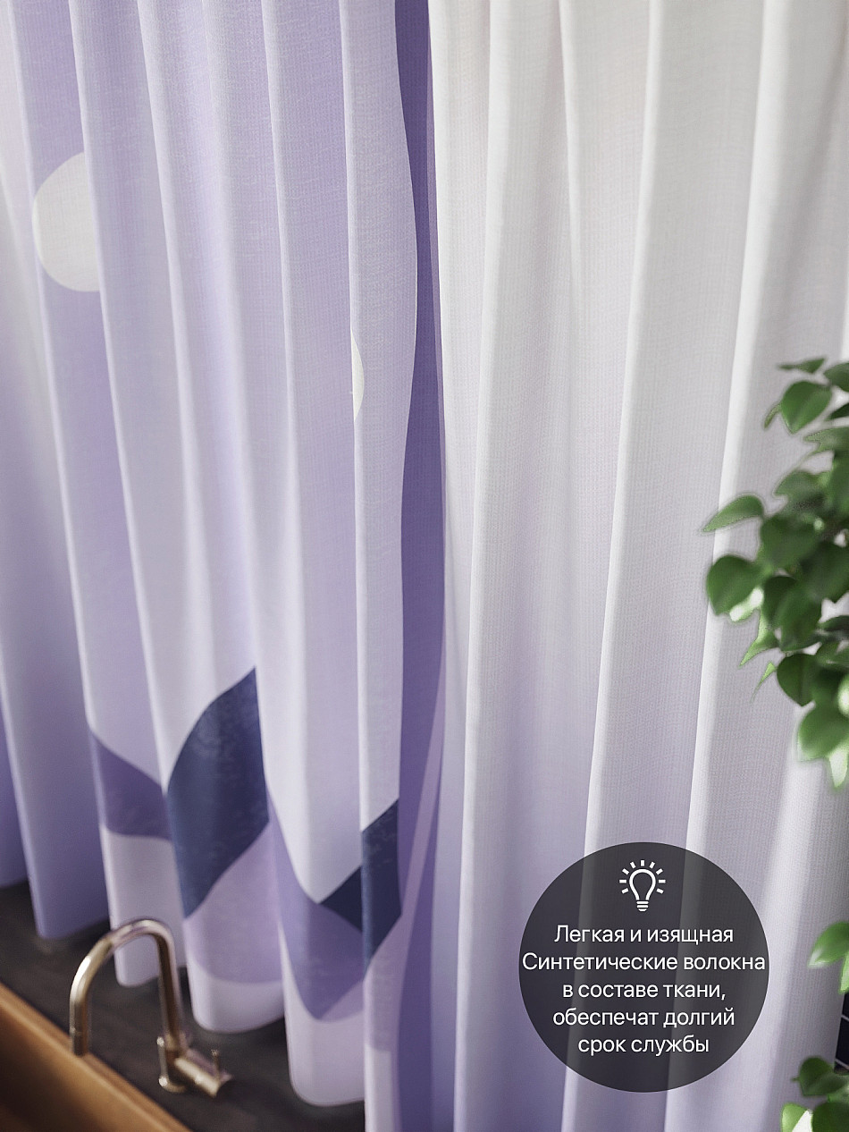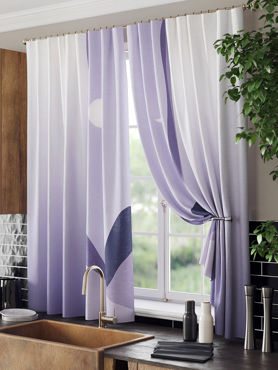 Комплект штор из легкой портьерной ткани (габардин) оформлен печатным рисунком. Печатный рисунок дает широкие возможности обновить интерьер фактически нет требуя ремонта за счет огромного выбора. Ткани с печатным рисунком безопасны и не содержат токсичных веществ. Не смотря на то что, материал легкий, он имеет высокую плотность, мало загрязнятся и не требует особого ухода даже после стирки, что важно для кухонных занавесок. Шторы не выцветают, не растягиваются, превосходно драпируются, образуя струящиеся складки. Прекрасное решение для создания красоты и уюта с помощью уникальных дизайнов.