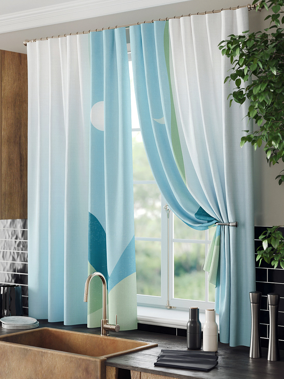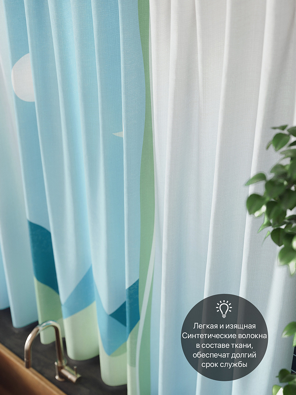 Комплект штор из легкой портьерной ткани (габардин) оформлен печатным рисунком. Печатный рисунок дает широкие возможности обновить интерьер фактически нет требуя ремонта за счет огромного выбора. Ткани с печатным рисунком безопасны и не содержат токсичных веществ. Не смотря на то что, материал легкий, он имеет высокую плотность, мало загрязнятся и не требует особого ухода даже после стирки, что важно для кухонных занавесок. Шторы не выцветают, не растягиваются, превосходно драпируются, образуя струящиеся складки. Прекрасное решение для создания красоты и уюта с помощью уникальных дизайнов.