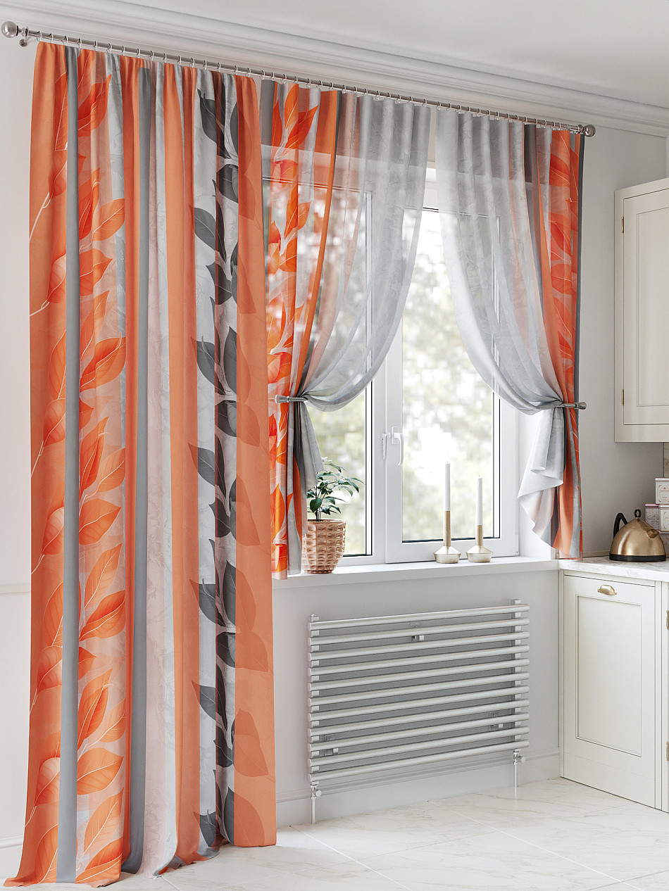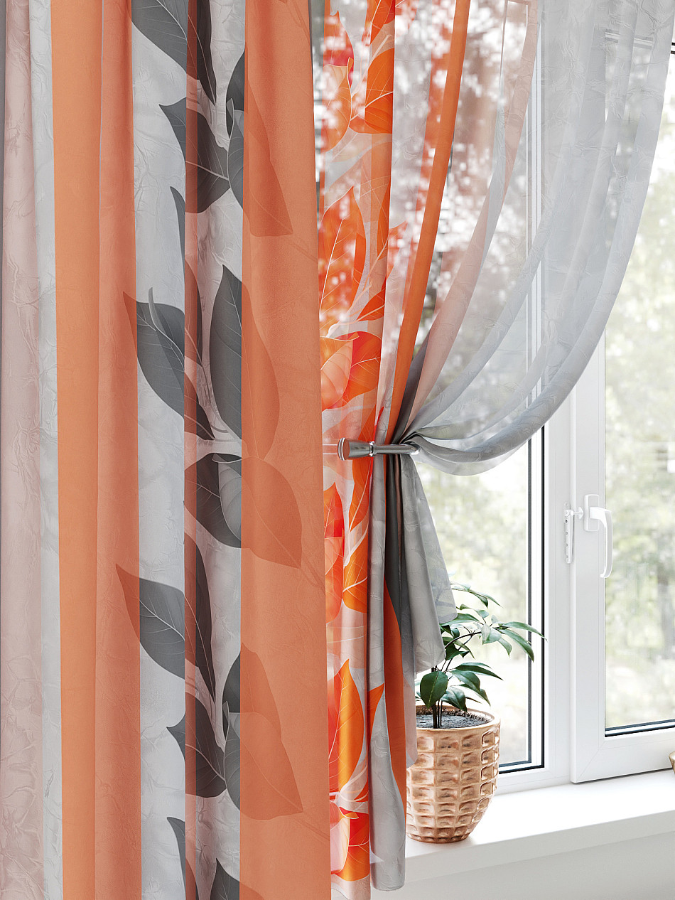 Портьера 150х250 см — 1 шт., вуаль 150х180 см — 2 шт. ( Уменьшить высоту ) Крепление: шторная лента (крючки), кулиска Подробнее
