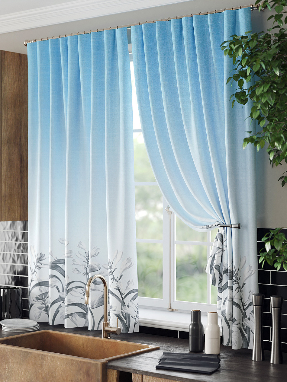 Комплект штор из легкой портьерной ткани (габардин) оформлен печатным рисунком. Печатный рисунок дает широкие возможности обновить интерьер фактически нет требуя ремонта за счет огромного выбора. Ткани с печатным рисунком безопасны и не содержат токсичных веществ. Не смотря на то что, материал легкий, он имеет высокую плотность, мало загрязнятся и не требует особого ухода даже после стирки, что важно для кухонных занавесок. Шторы не выцветают, не растягиваются, превосходно драпируются, образуя струящиеся складки. Прекрасное решение для создания красоты и уюта с помощью уникальных дизайнов.