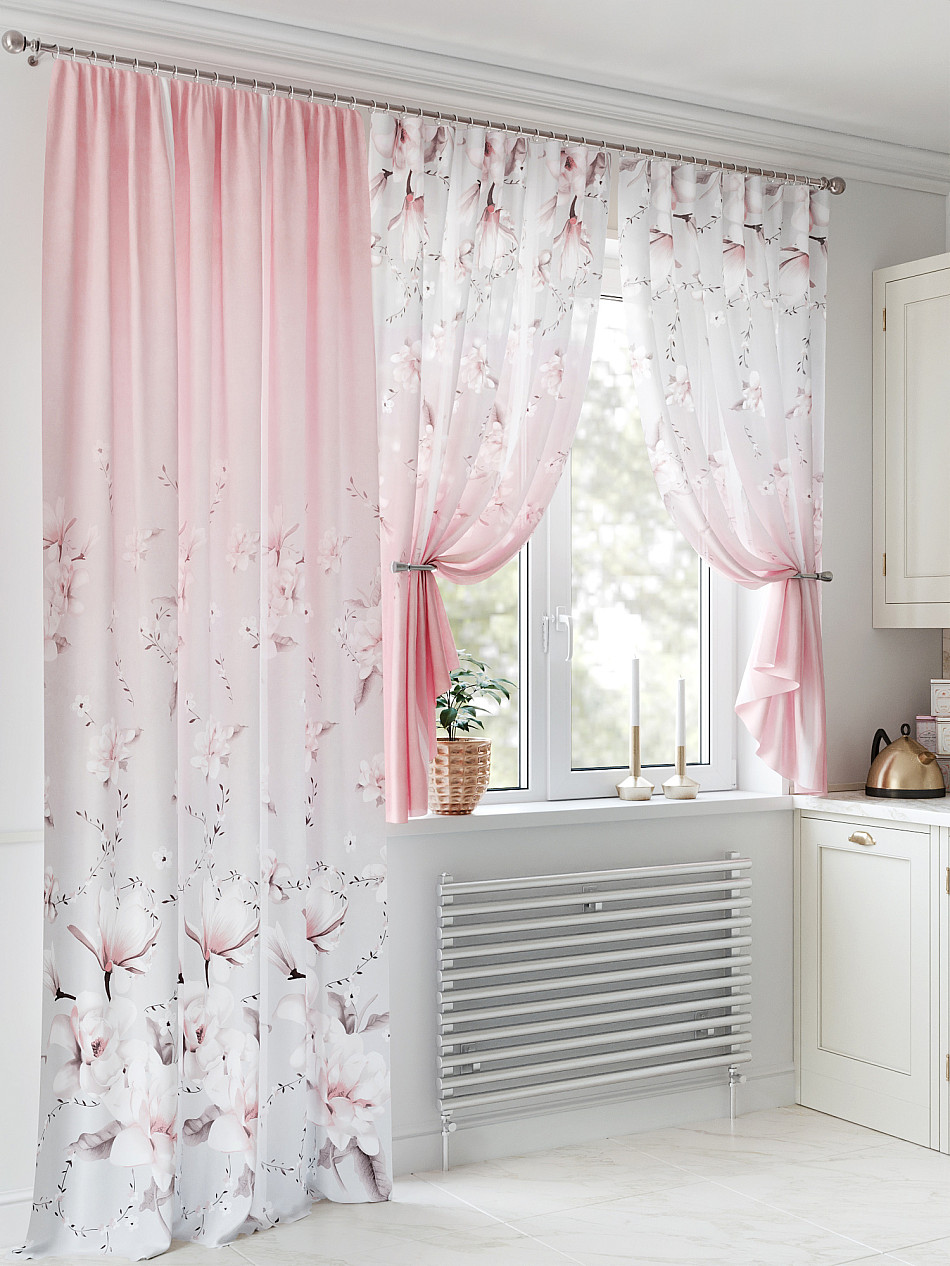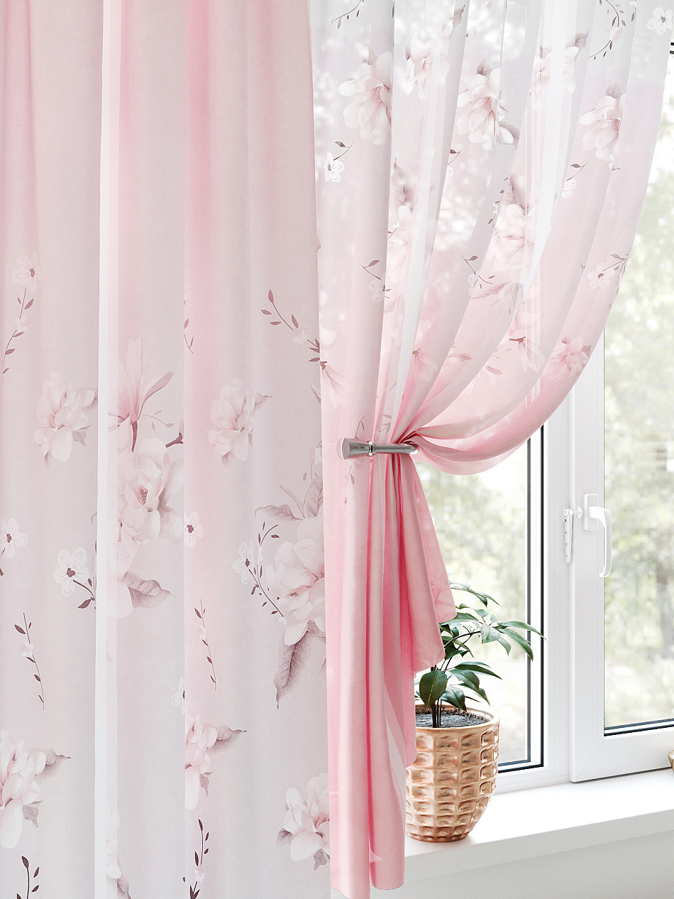 Тюль 2 шт.: Легкая основа (вуаль) оформлена флористическим рисунком. Ширина — 150 см., высота — 180 см., крепление — шторная лента (крючки).