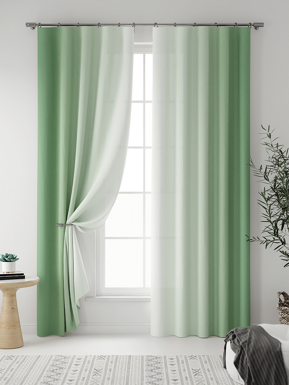 Шторы приятного зеленого цвета с плавным переходом, хорошо защищают от солнца, вуаль особо не впечатлила, на мой взгляд она не очень подходит.