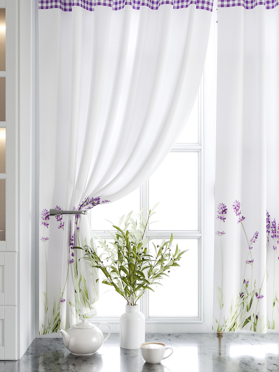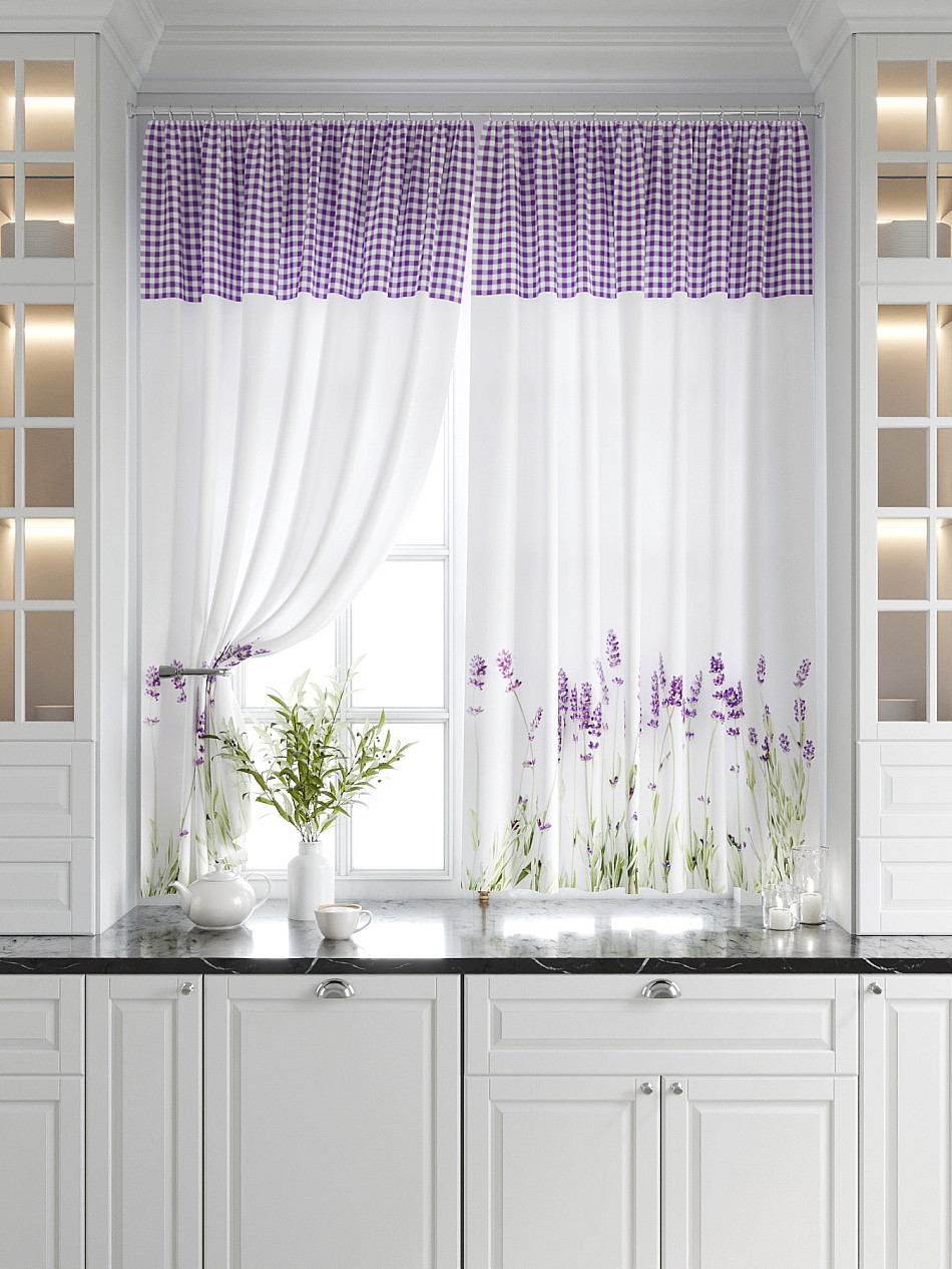 Комплект штор из легкой портьерной ткани (габардин) оформлен печатным рисунком. Печатный рисунок дает широкие возможности обновить интерьер фактически нет требуя ремонта за счет огромного выбора. Ткани с печатным рисунком безопасны и не содержат токсичных веществ. Не смотря на то что, материал легкий, он имеет высокую плотность, мало загрязнятся и не требует особого ухода даже после стирки, что важно для кухонных занавесок. Шторы не выцветают, не растягиваются, превосходно драпируются, образуя струящиеся складки. Прекрасное решение для создания красоты и уюта с помощью уникальных дизайнов.