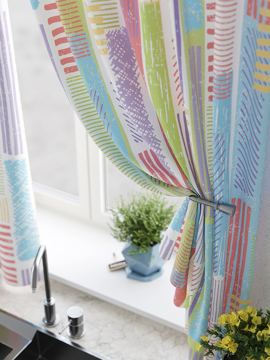 Портьеры 2 шт: Комплект штор из легкой портьерной ткани (габардин) оформлен печатным рисунком. Печатный рисунок дает широкие возможности обновить интерьер фактически нет требуя ремонта за счет огромного выбора. Ткани с печатным рисунком безопасны и не содержат токсичных веществ. Не смотря на то что, материал легкий, он имеет высокую плотность, мало загрязнятся и не требует особого ухода даже после стирки, что важно для кухонных занавесок. Шторы не выцветают, не растягиваются, превосходно драпируются, образуя струящиеся складки. Прекрасное решение для создания красоты и уюта с помощью уникальных дизайнов.