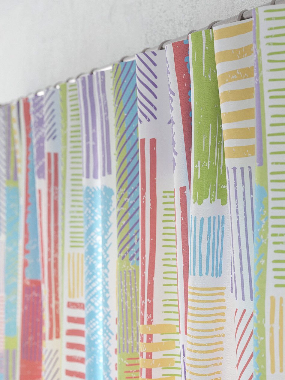 По верхнему краю портьер пришита шторная тесьма 6 см, с ее помощью затянув узелки от кордовых нитей с обеих сторон и стянув их до нужного размера можно сформировать округлые складки, далее вставить крючки в кармашки и повесить на карниз. Обязательно проверьте кордовые нити – они должны быть надежно завязаны, в противном случае во время стягивания они могут вылететь. Шторная тесьма имеет два ряда кармашков, с их помощью можно регулировать не только длину, но и ширину. Такое крепление подходит для всех типов карнизов.