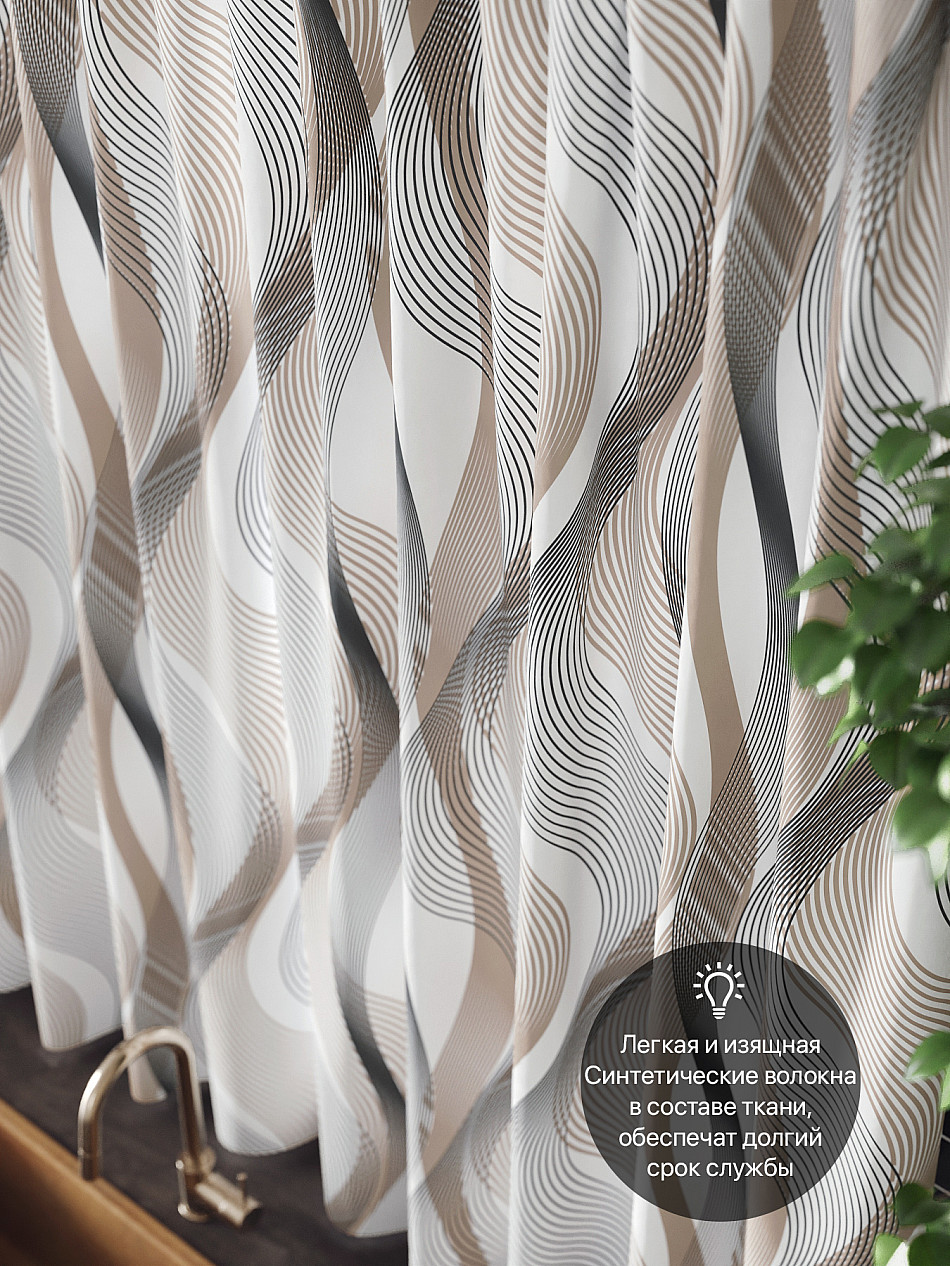 Комплект штор из легкой портьерной ткани (габардин) оформлен печатным рисунком. Печатный рисунок дает широкие возможности обновить интерьер фактически нет требуя ремонта за счет огромного выбора. Ткани с печатным рисунком безопасны и не содержат токсичных веществ. Не смотря на то что, материал легкий, он имеет высокую плотность, мало загрязнятся и не требует особого ухода даже после стирки, что важно для кухонных занавесок. Шторы не выцветают, не растягиваются, превосходно драпируются, образуя струящиеся складки. Прекрасное решение для создания красоты и уюта с помощью уникальных дизайнов.