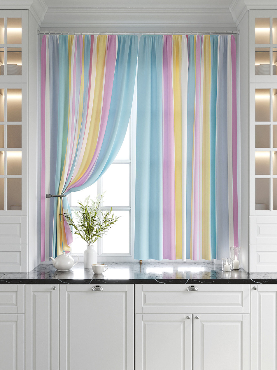 Комплект штор из легкой портьерной ткани (габардин) оформлен печатным рисунком. Печатный рисунок дает широкие возможности обновить интерьер фактически нет требуя ремонта за счет огромного выбора. Ткани с печатным рисунком безопасны и не содержат токсичных веществ. Не смотря на то что, материал легкий, он имеет высокую плотность, мало загрязнятся и не требует особого ухода даже после стирки, что важно для кухонных занавесок. Шторы не выцветают, не растягиваются, превосходно драпируются, образуя струящиеся складки. Прекрасное решение для создания красоты и уюта с помощью уникальных дизайнов.