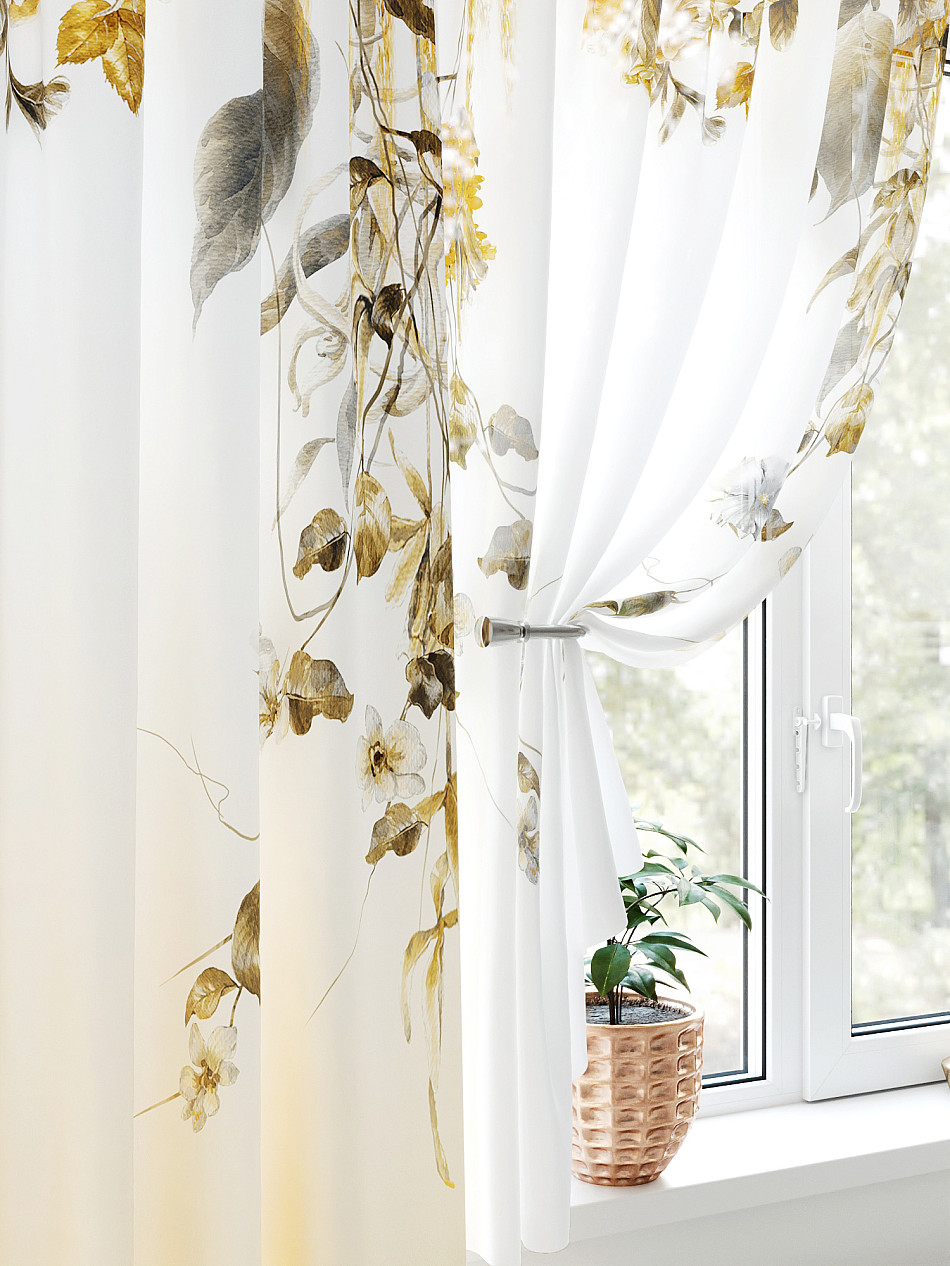 Тюль 2 шт.: Легкая основа (вуаль) оформлена флористическим рисунком. Ширина — 150 см., высота — 180 см., крепление — шторная лента (крючки).