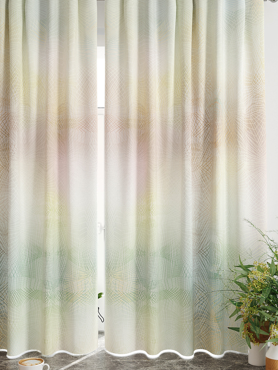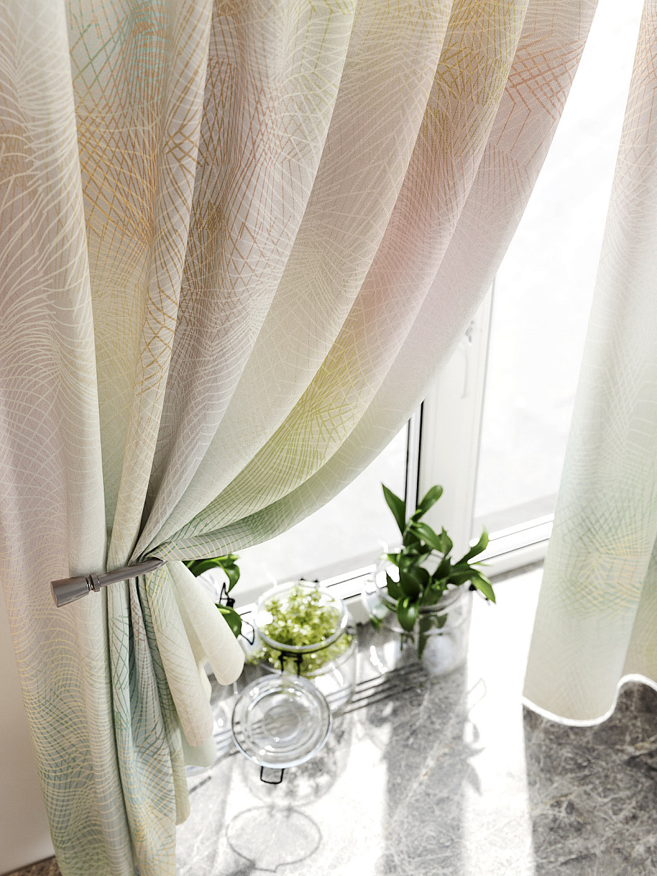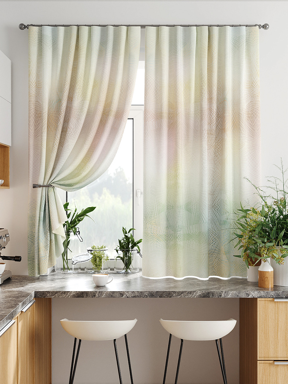 Комплект штор из легкой портьерной ткани (габардин) оформлен печатным рисунком. Печатный рисунок дает широкие возможности обновить интерьер фактически нет требуя ремонта за счет огромного выбора. Ткани с печатным рисунком безопасны и не содержат токсичных веществ. Не смотря на то что, материал легкий, он имеет высокую плотность, мало загрязнятся и не требует особого ухода даже после стирки, что важно для кухонных занавесок. Шторы не выцветают, не растягиваются, превосходно драпируются, образуя струящиеся складки. Прекрасное решение для создания красоты и уюта с помощью уникальных дизайнов.