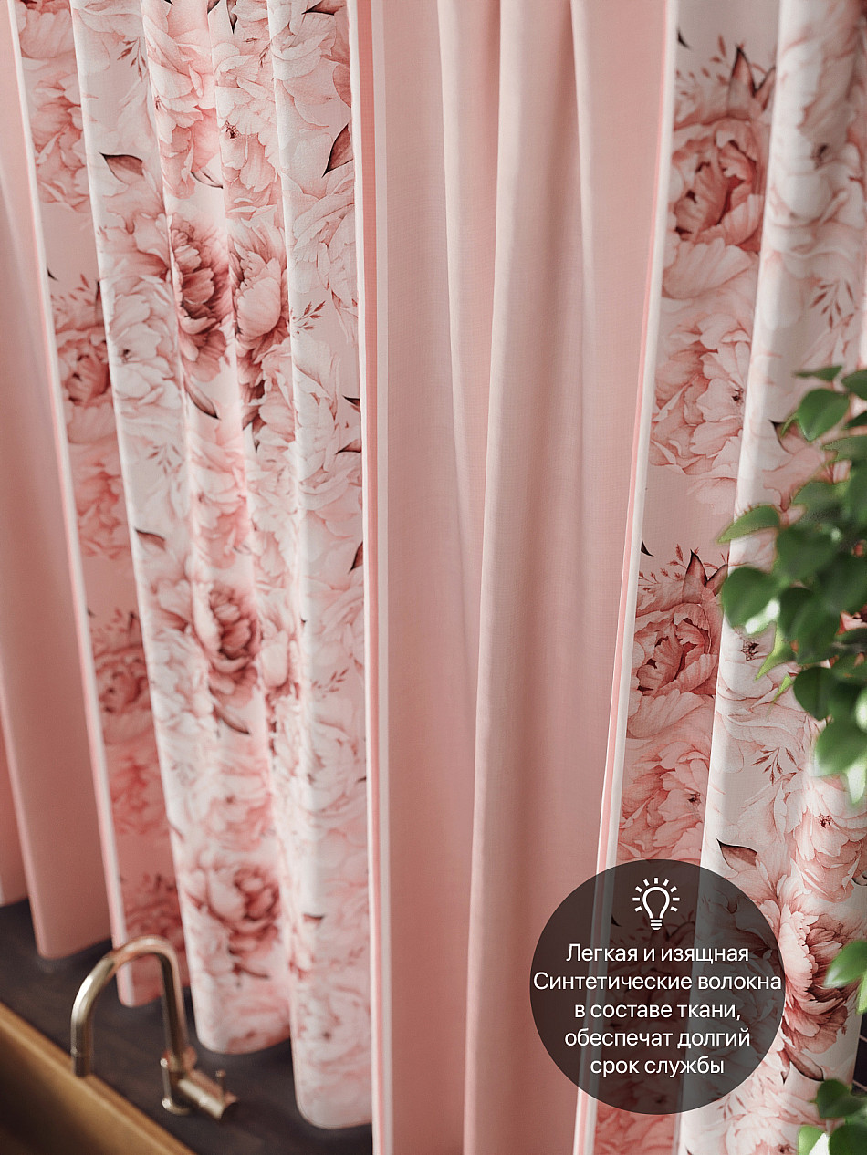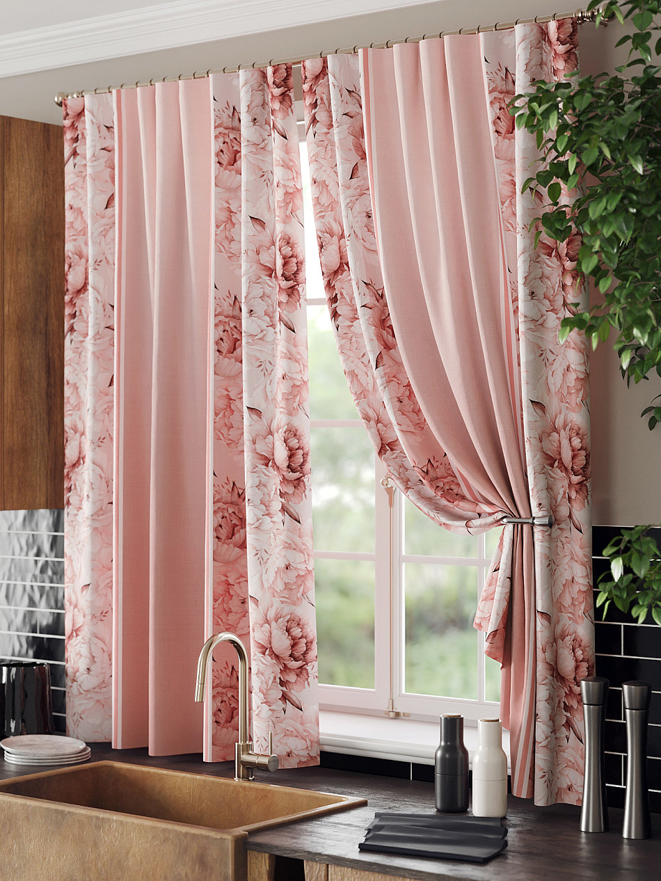 Комплект штор из легкой портьерной ткани (габардин) оформлен печатным рисунком. Печатный рисунок дает широкие возможности обновить интерьер фактически нет требуя ремонта за счет огромного выбора. Ткани с печатным рисунком безопасны и не содержат токсичных веществ. Не смотря на то что, материал легкий, он имеет высокую плотность, мало загрязнятся и не требует особого ухода даже после стирки, что важно для кухонных занавесок. Шторы не выцветают, не растягиваются, превосходно драпируются, образуя струящиеся складки. Прекрасное решение для создания красоты и уюта с помощью уникальных дизайнов.