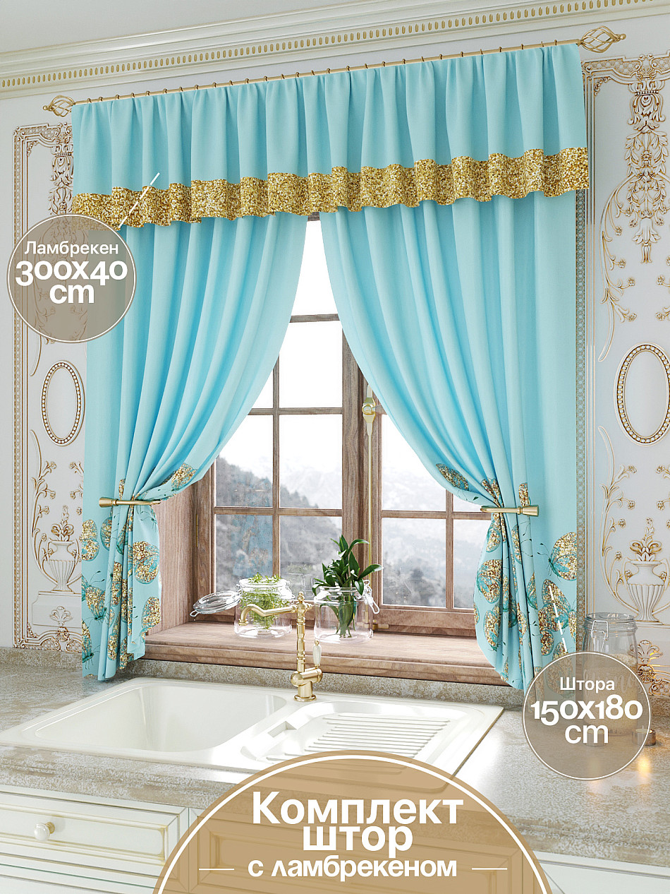 Портьеры 150х180 см. — 2 шт., Ламбрекен 300х40 см. — 1 шт. ( Изменить высоту) Крепление: шторная лента (крючки), кулиска Подробнее