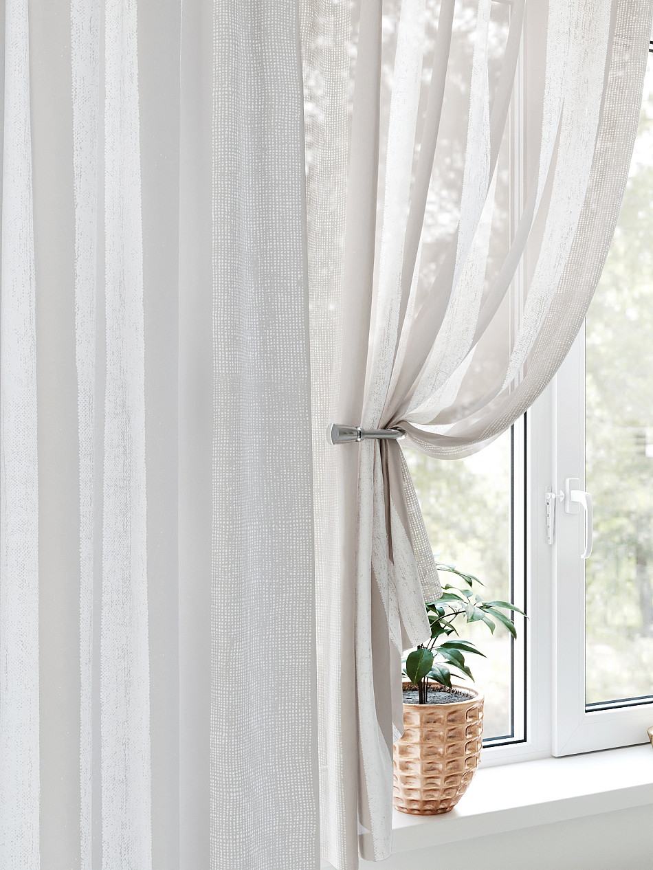 Портьера 1 шт. Подхват - доп.услуга. Комплект для интерьера с балконной дверью, состоит из легкой портьеры для двери и тюли для окна. Оригинальная ассиметричная конструкция оживит любое помещение. Красивая одиночная портьера украсит балконный проём и обеспечит удобный доступ к двери. Легкая вуаль с пышными складками создаст воздушный образ окна и защитит от прямых солнечных лучей, мягко рассеивая свет.