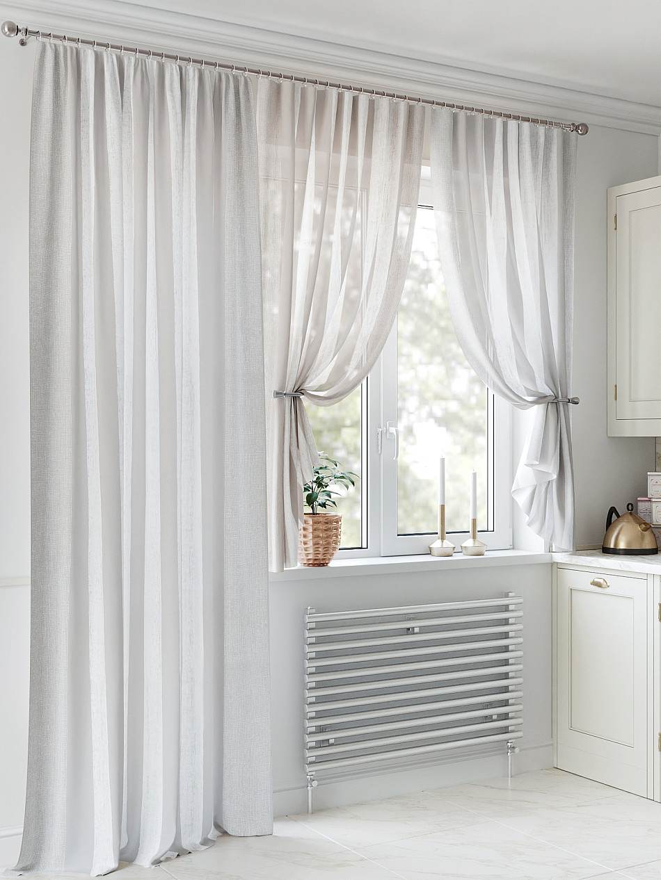 Портьера 150х250 см — 1 шт., вуаль 150х180 см — 2 шт. ( Уменьшить высоту ) Крепление: шторная лента (крючки), кулиска Подробнее