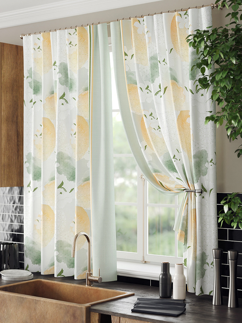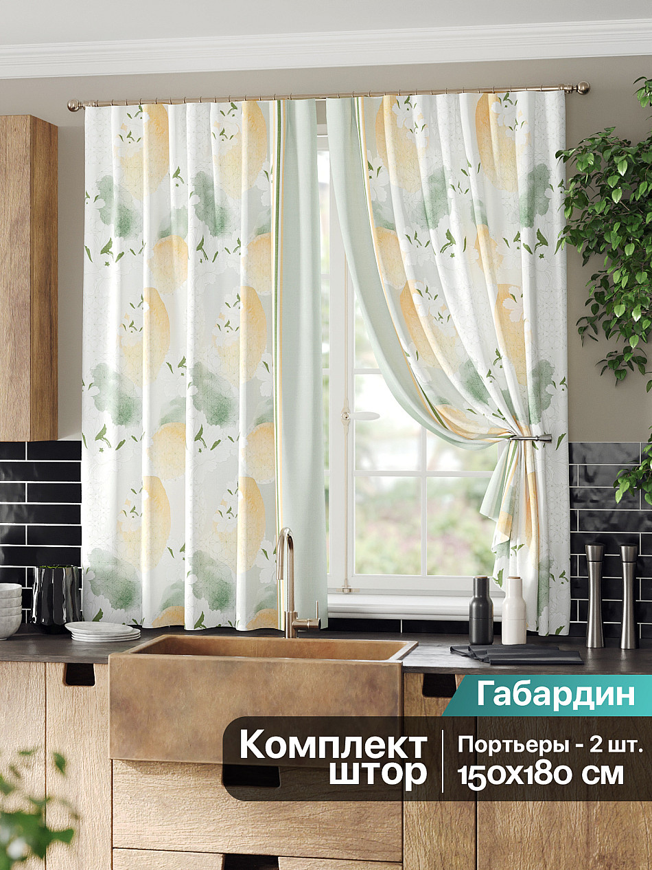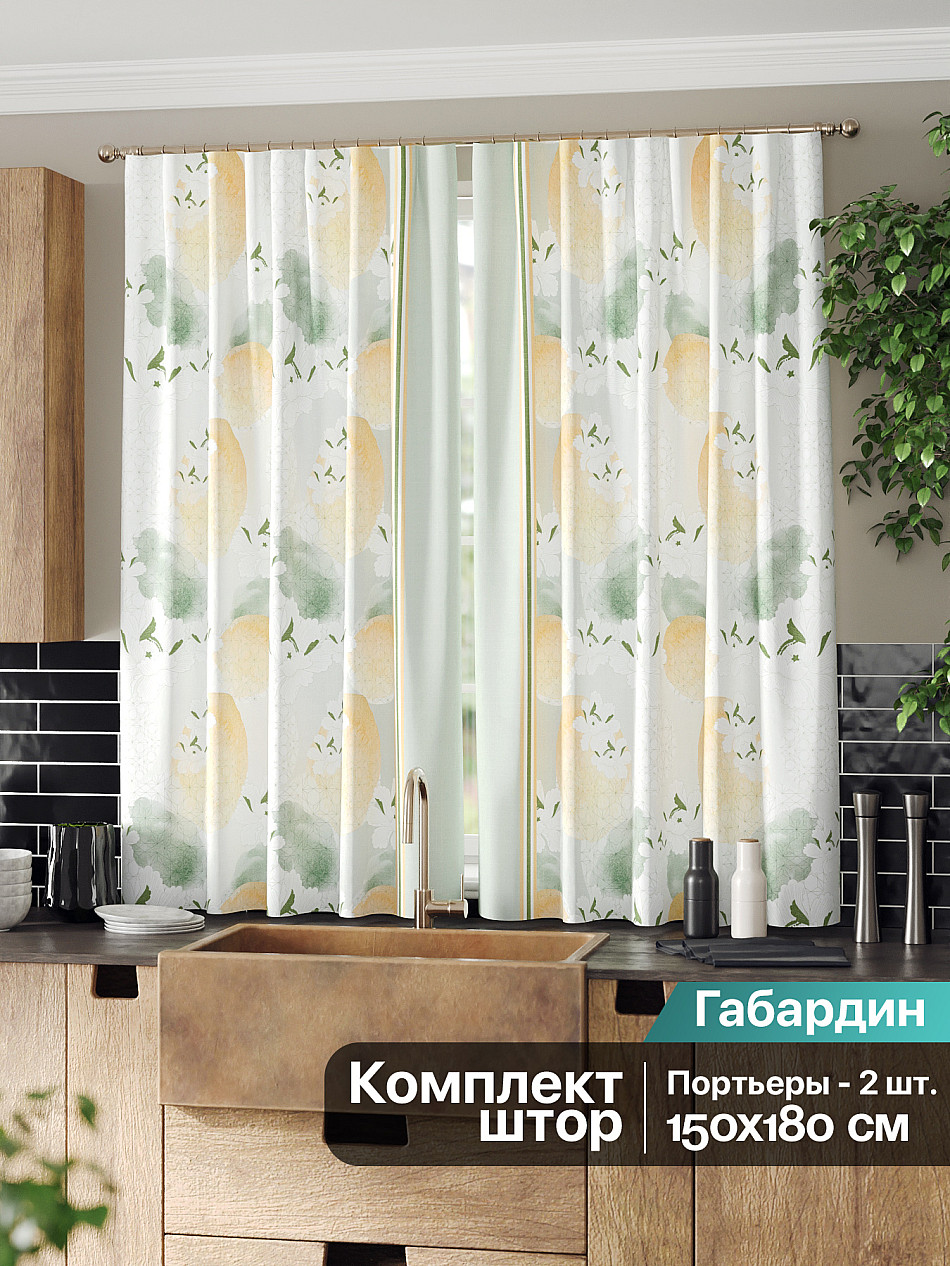 Комплект штор из легкой портьерной ткани (габардин) оформлен печатным рисунком. Печатный рисунок дает широкие возможности обновить интерьер фактически нет требуя ремонта за счет огромного выбора. Ткани с печатным рисунком безопасны и не содержат токсичных веществ. Не смотря на то что, материал легкий, он имеет высокую плотность, мало загрязнятся и не требует особого ухода даже после стирки, что важно для кухонных занавесок. Шторы не выцветают, не растягиваются, превосходно драпируются, образуя струящиеся складки. Прекрасное решение для создания красоты и уюта с помощью уникальных дизайнов.