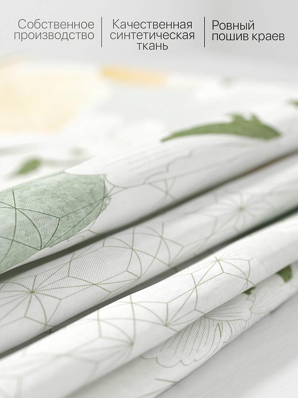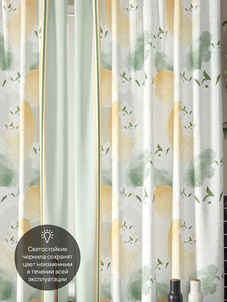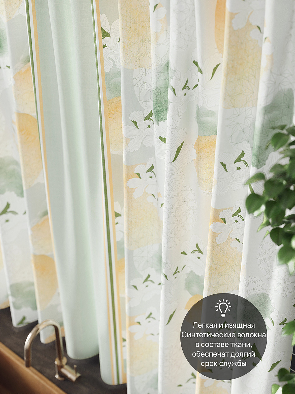Комплект штор из легкой портьерной ткани (габардин) оформлен печатным рисунком. Печатный рисунок дает широкие возможности обновить интерьер фактически нет требуя ремонта за счет огромного выбора. Ткани с печатным рисунком безопасны и не содержат токсичных веществ. Не смотря на то что, материал легкий, он имеет высокую плотность, мало загрязнятся и не требует особого ухода даже после стирки, что важно для кухонных занавесок. Шторы не выцветают, не растягиваются, превосходно драпируются, образуя струящиеся складки. Прекрасное решение для создания красоты и уюта с помощью уникальных дизайнов.