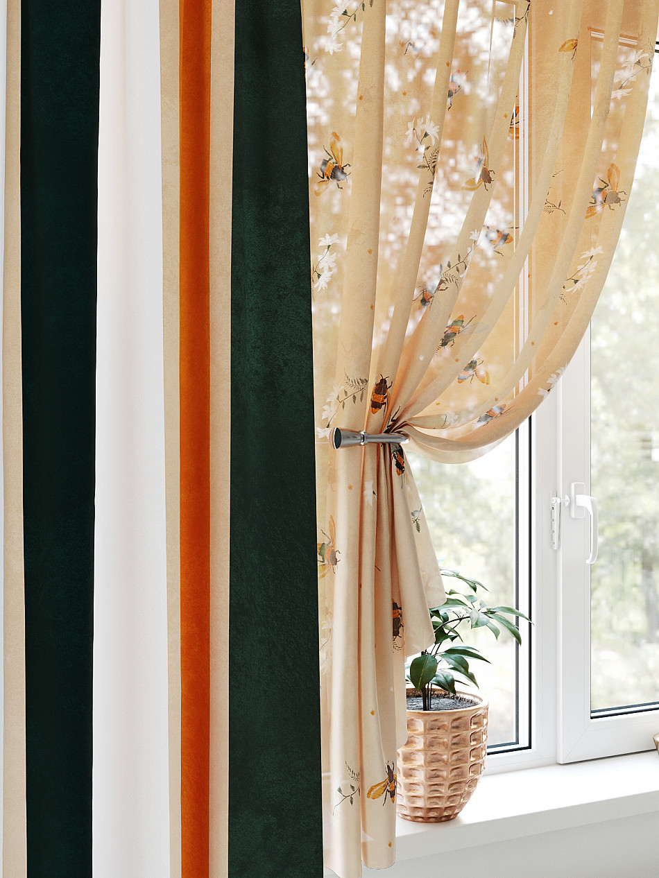 Портьера 150х270 см — 1 шт., вуаль 150х180 см — 2 шт. ( Уменьшить высоту ) Крепление: шторная лента (крючки), кулиска Подробнее