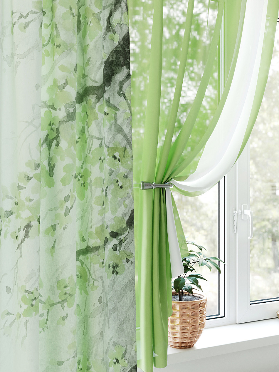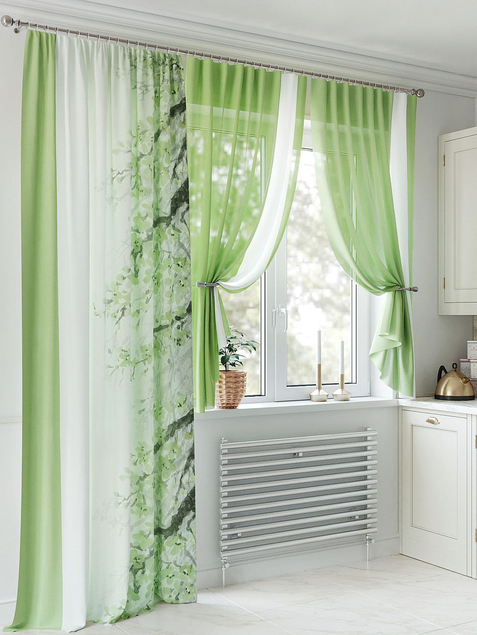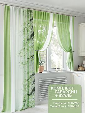 Портьера 150х250 см — 1 шт., вуаль 150х180 см — 2 шт. ( Уменьшить высоту ) Крепление: шторная лента (крючки), кулиска Подробнее
