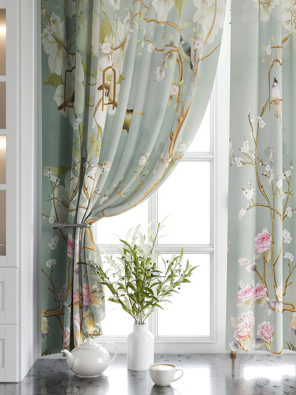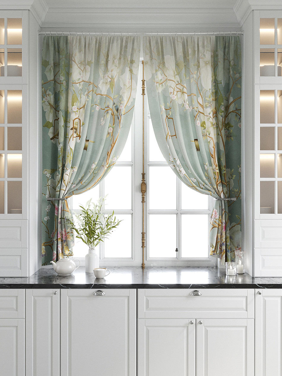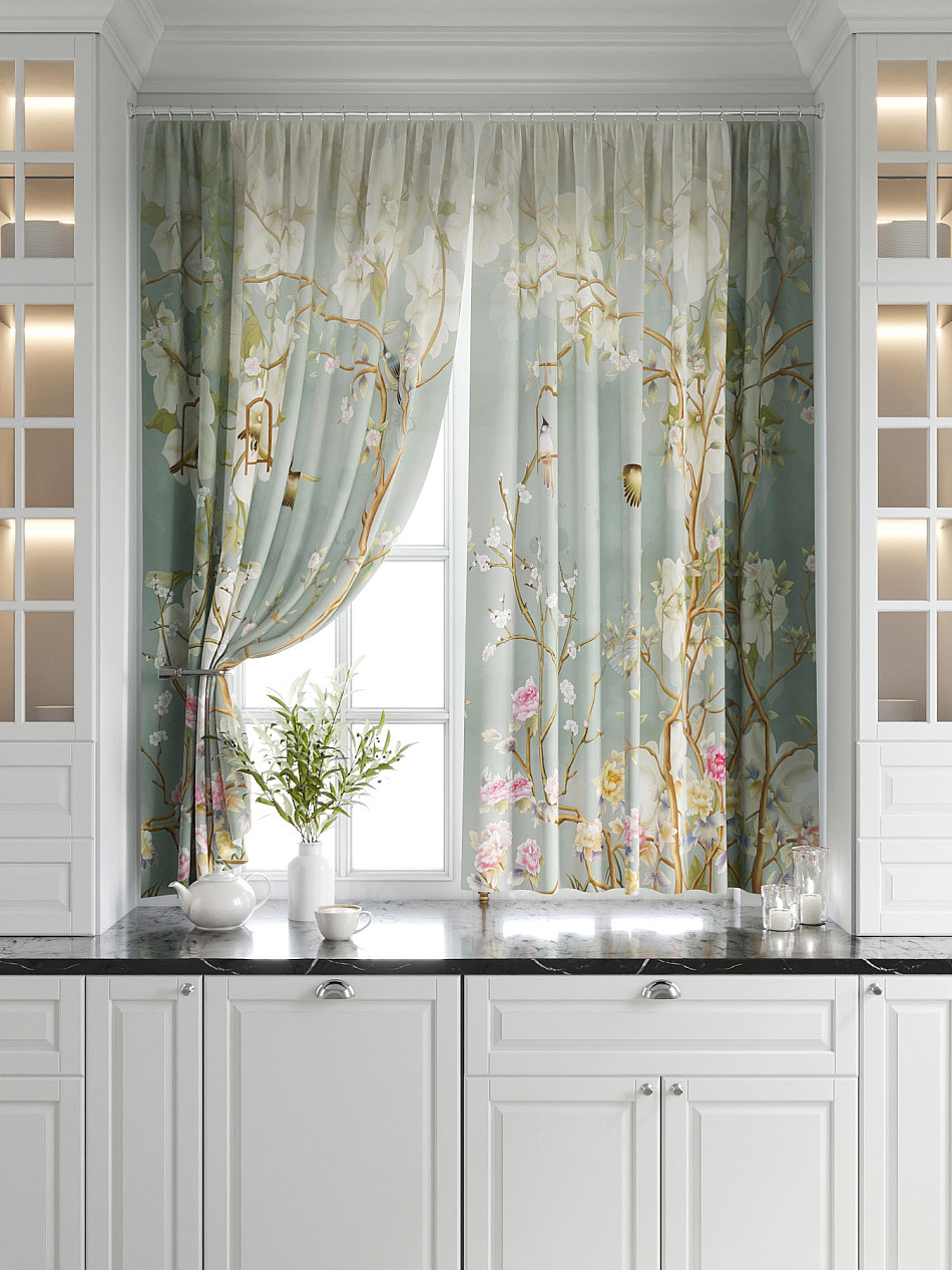 Комплект штор из легкой портьерной ткани (габардин) оформлен печатным рисунком. Печатный рисунок дает широкие возможности обновить интерьер фактически нет требуя ремонта за счет огромного выбора. Ткани с печатным рисунком безопасны и не содержат токсичных веществ. Не смотря на то что, материал легкий, он имеет высокую плотность, мало загрязнятся и не требует особого ухода даже после стирки, что важно для кухонных занавесок. Шторы не выцветают, не растягиваются, превосходно драпируются, образуя струящиеся складки. Прекрасное решение для создания красоты и уюта с помощью уникальных дизайнов.