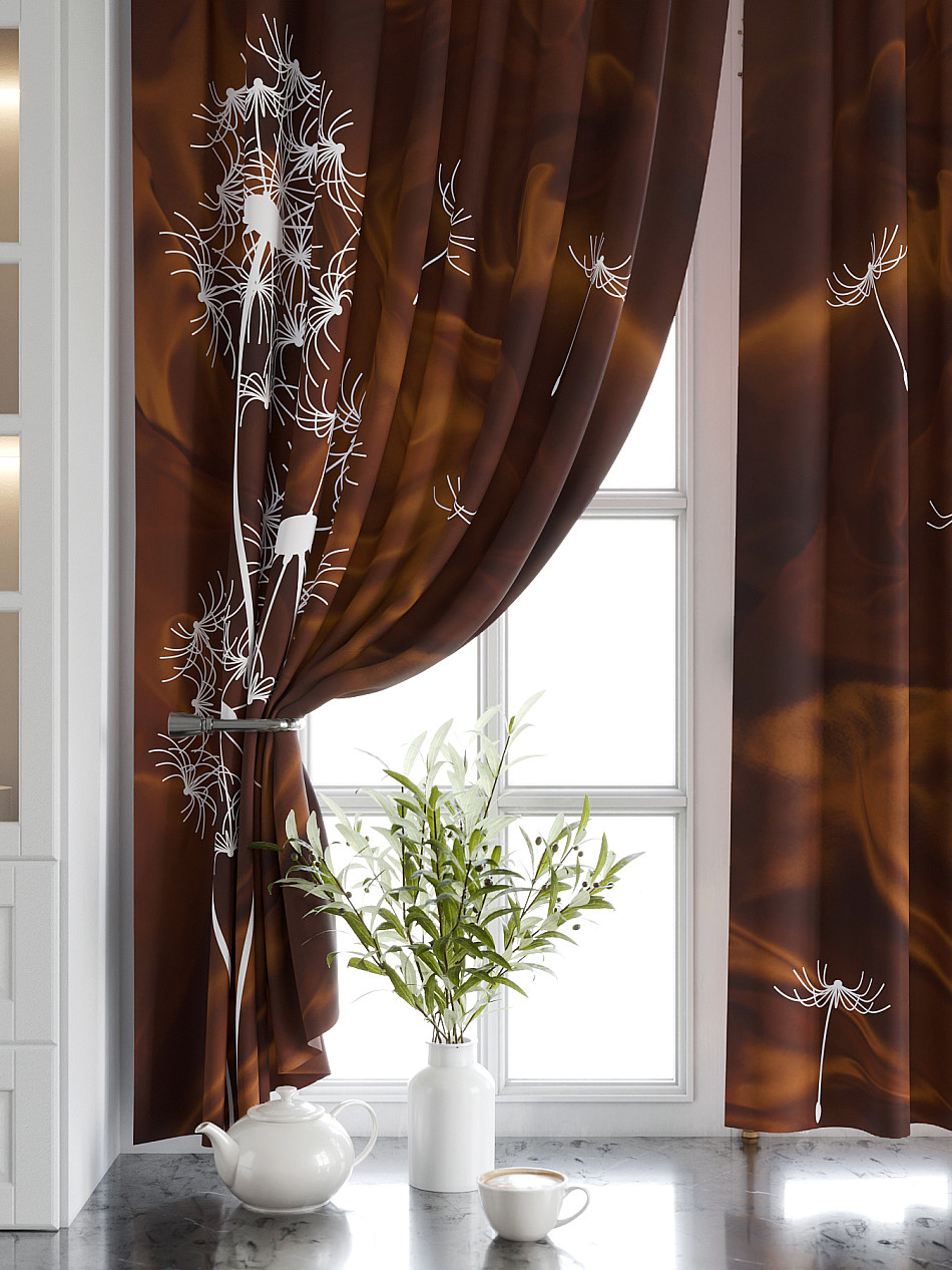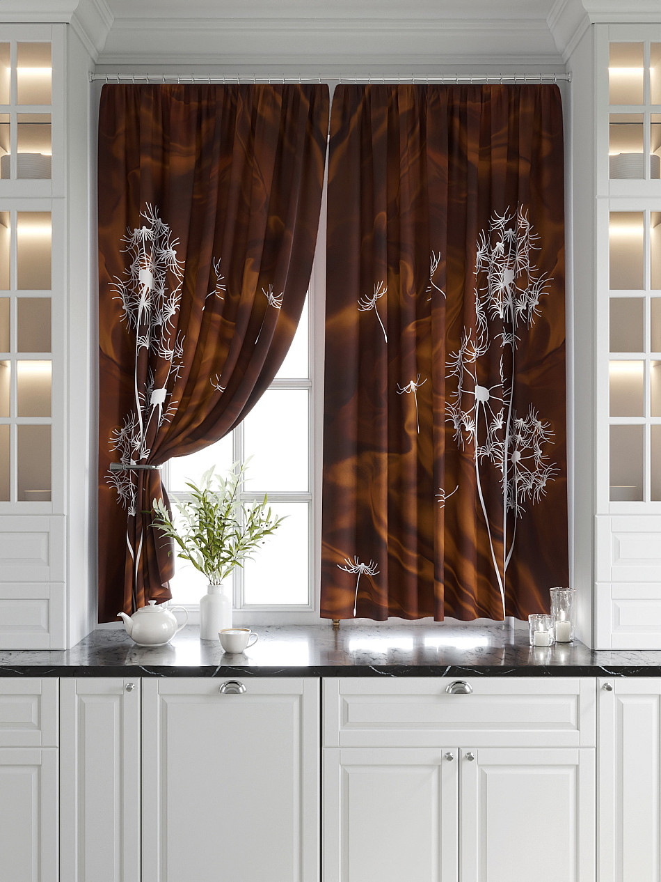 Комплект штор из легкой портьерной ткани (габардин) оформлен печатным рисунком. Печатный рисунок дает широкие возможности обновить интерьер фактически нет требуя ремонта за счет огромного выбора. Ткани с печатным рисунком безопасны и не содержат токсичных веществ. Не смотря на то что, материал легкий, он имеет высокую плотность, мало загрязнятся и не требует особого ухода даже после стирки, что важно для кухонных занавесок. Шторы не выцветают, не растягиваются, превосходно драпируются, образуя струящиеся складки. Прекрасное решение для создания красоты и уюта с помощью уникальных дизайнов.