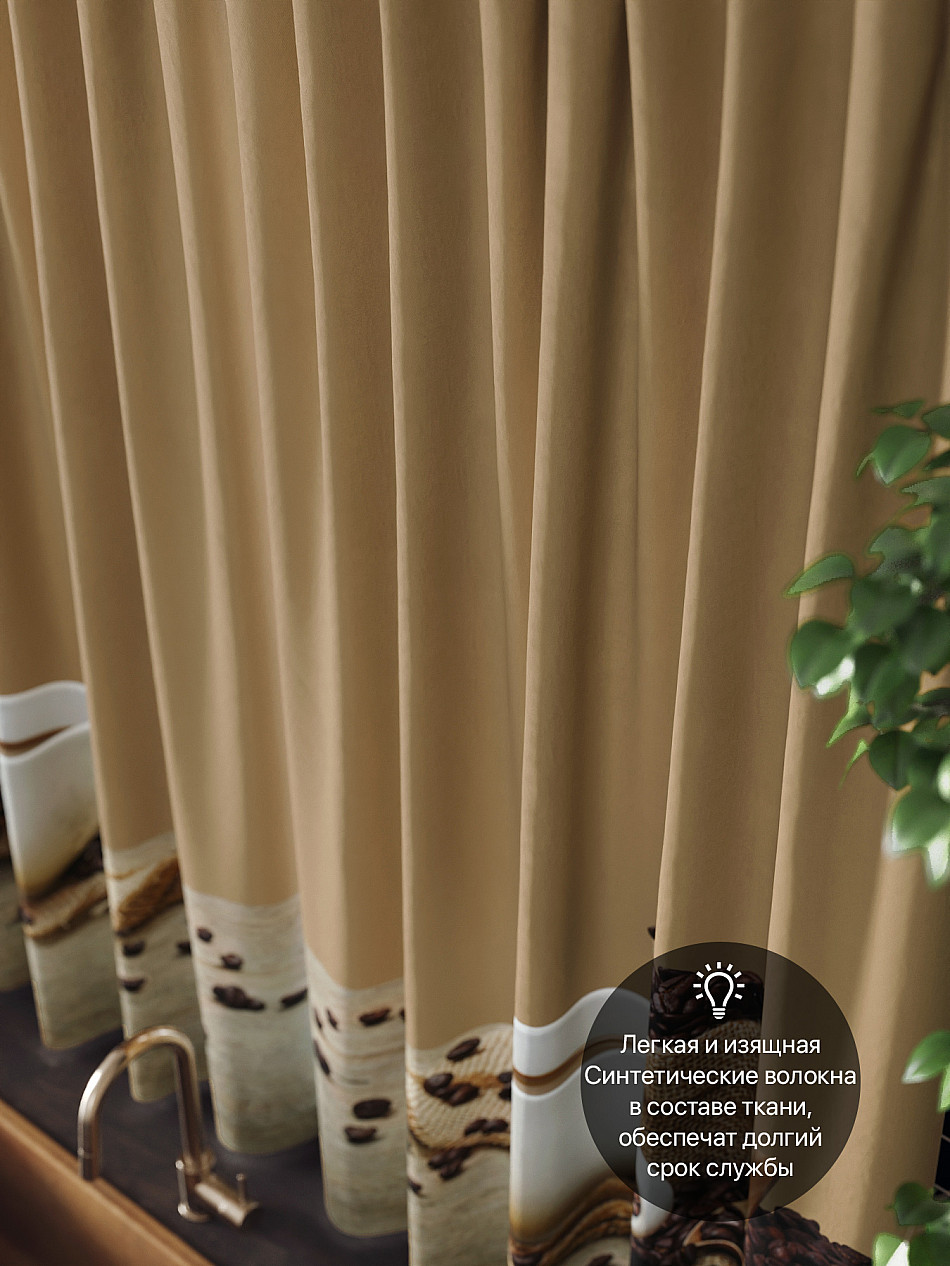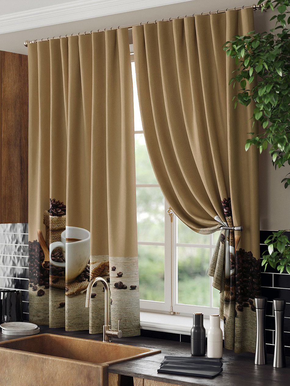 Комплект штор из легкой портьерной ткани (габардин) оформлен печатным рисунком. Печатный рисунок дает широкие возможности обновить интерьер фактически нет требуя ремонта за счет огромного выбора. Ткани с печатным рисунком безопасны и не содержат токсичных веществ. Не смотря на то что, материал легкий, он имеет высокую плотность, мало загрязнятся и не требует особого ухода даже после стирки, что важно для кухонных занавесок. Шторы не выцветают, не растягиваются, превосходно драпируются, образуя струящиеся складки. Прекрасное решение для создания красоты и уюта с помощью уникальных дизайнов.