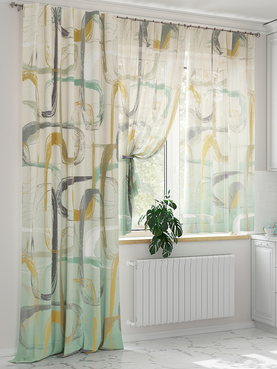 Портьера 1 шт. Подхват - доп.услуга. Комплект для интерьера с балконной дверью, состоит из легкой портьеры для двери и тюли для окна. Оригинальная ассиметричная конструкция оживит любое помещение. Красивая одиночная портьера украсит балконный проём и обеспечит удобный доступ к двери. Легкая вуаль с пышными складками создаст воздушный образ окна и защитит от прямых солнечных лучей, мягко рассеивая свет.