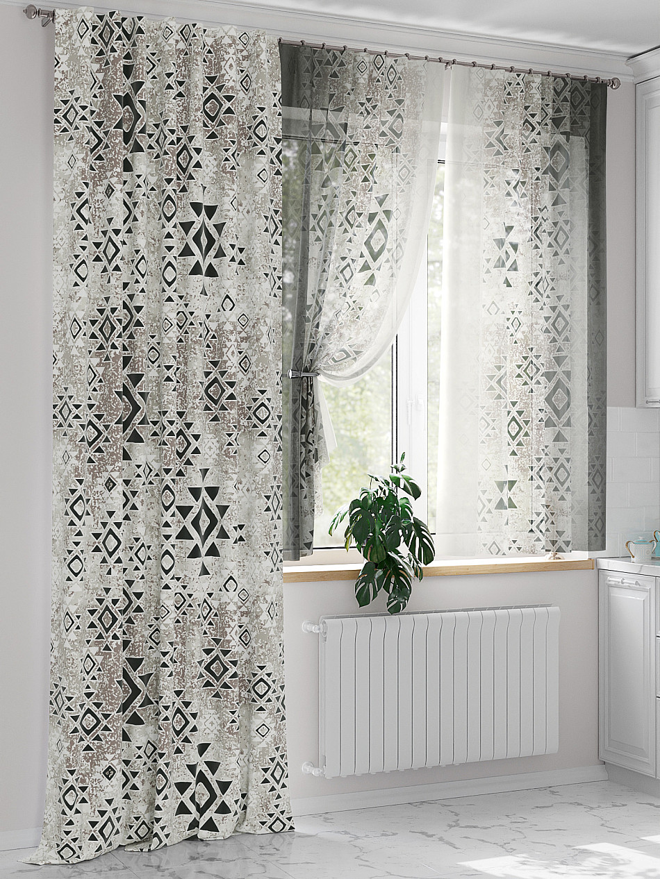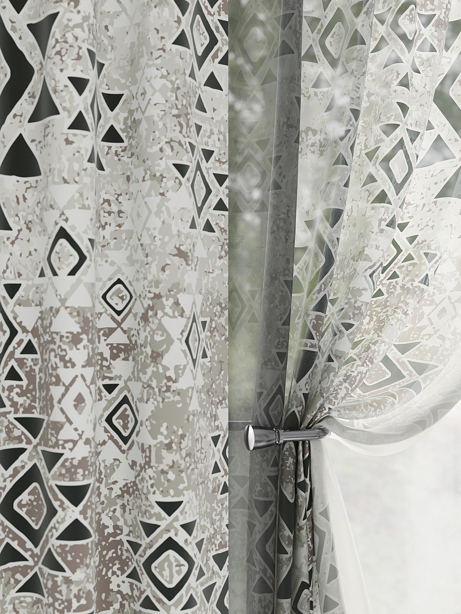 Тюль 2 шт.: Легкая основа (вуаль) оформлена геометрическим рисунком. Ширина — 150 см., высота — 180 см., крепление — шторная лента (крючки).