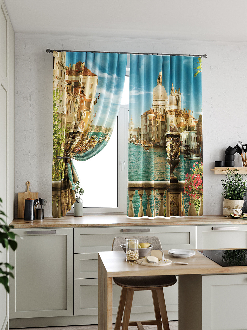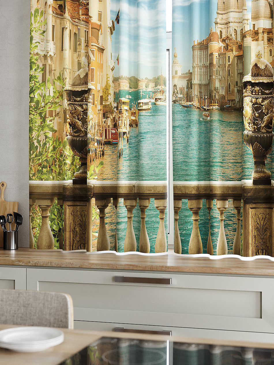 Комплект штор из легкой портьерной ткани (габардин) оформлен печатным рисунком. Печатный рисунок дает широкие возможности обновить интерьер фактически нет требуя ремонта за счет огромного выбора. Ткани с печатным рисунком безопасны и не содержат токсичных веществ. Не смотря на то что, материал легкий, он имеет высокую плотность, мало загрязнятся и не требует особого ухода даже после стирки, что важно для кухонных занавесок. Шторы не выцветают, не растягиваются, превосходно драпируются, образуя струящиеся складки. Прекрасное решение для создания красоты и уюта с помощью уникальных дизайнов.