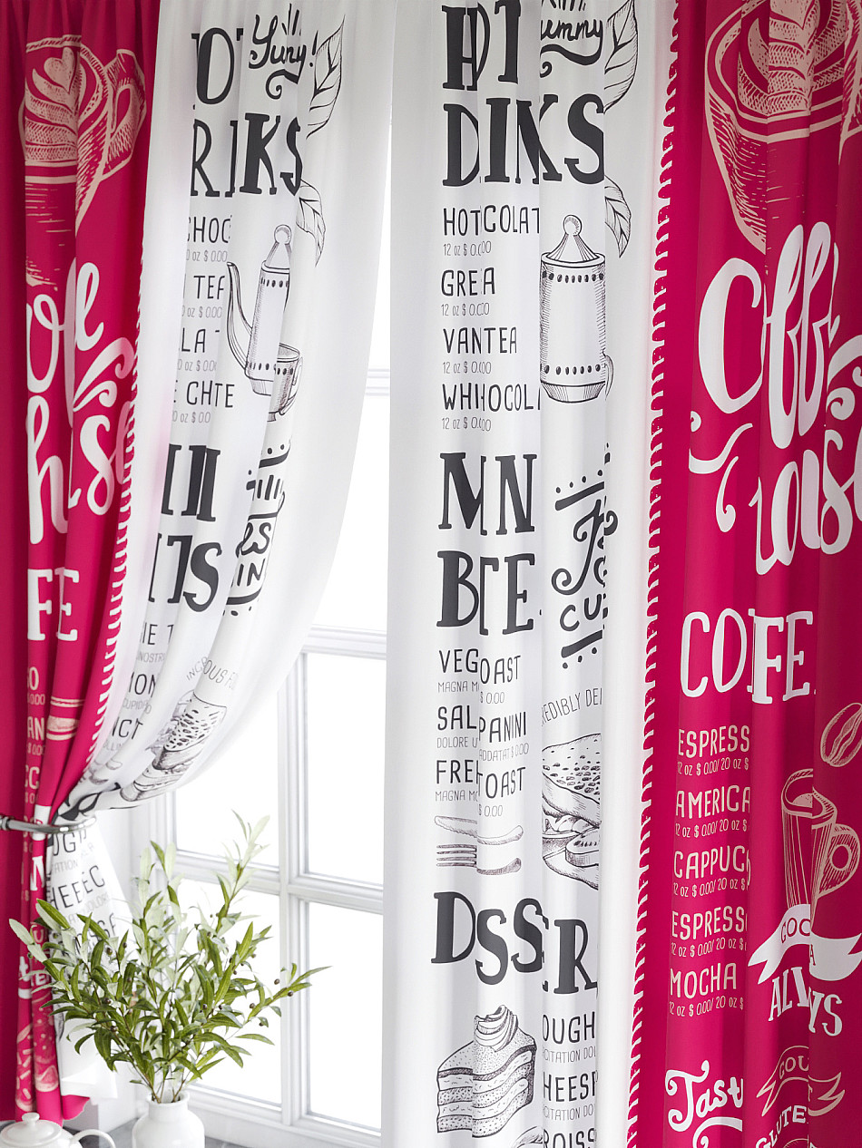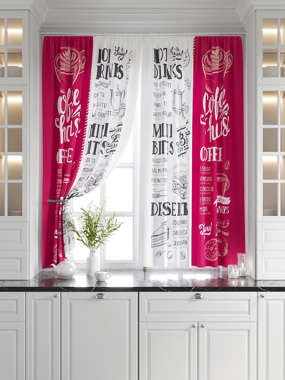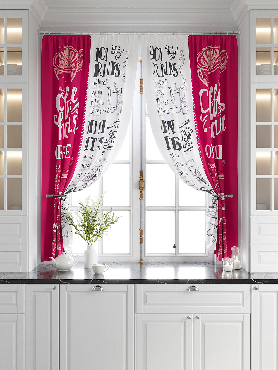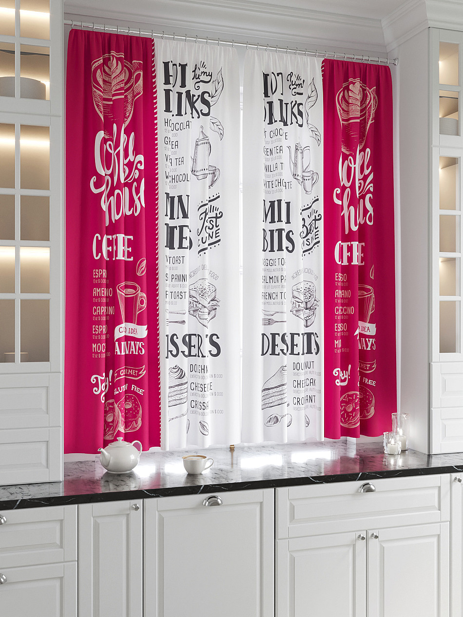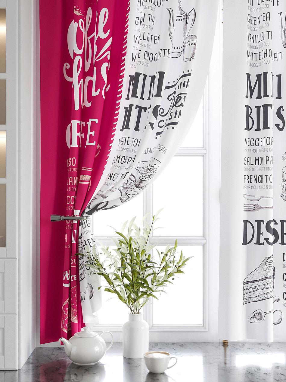 Комплект штор из легкой портьерной ткани (габардин) оформлен печатным рисунком. Печатный рисунок дает широкие возможности обновить интерьер фактически нет требуя ремонта за счет огромного выбора. Ткани с печатным рисунком безопасны и не содержат токсичных веществ. Не смотря на то что, материал легкий, он имеет высокую плотность, мало загрязнятся и не требует особого ухода даже после стирки, что важно для кухонных занавесок. Шторы не выцветают, не растягиваются, превосходно драпируются, образуя струящиеся складки. Прекрасное решение для создания красоты и уюта с помощью уникальных дизайнов.