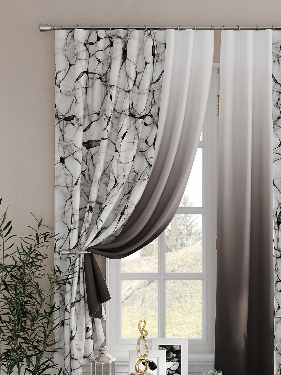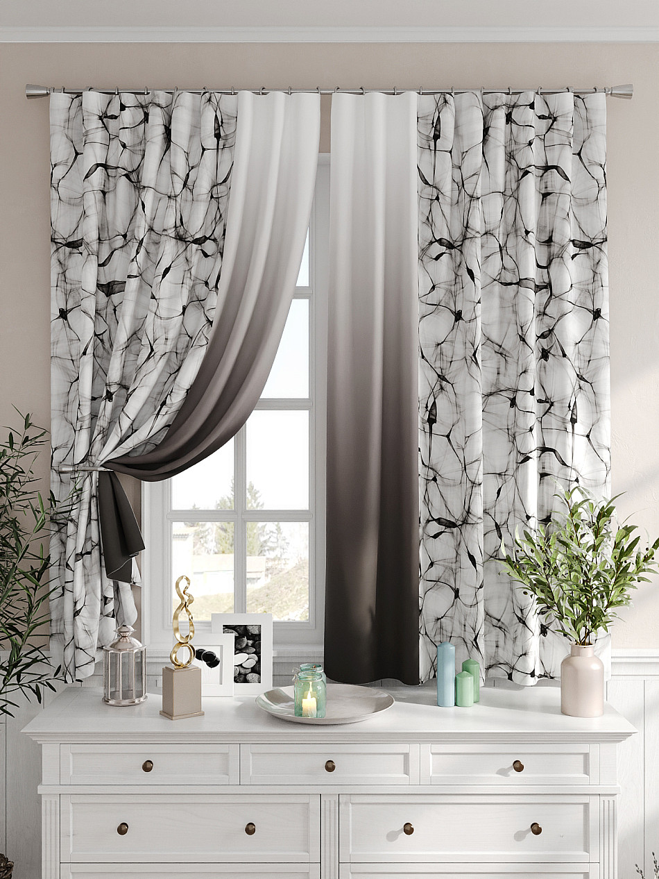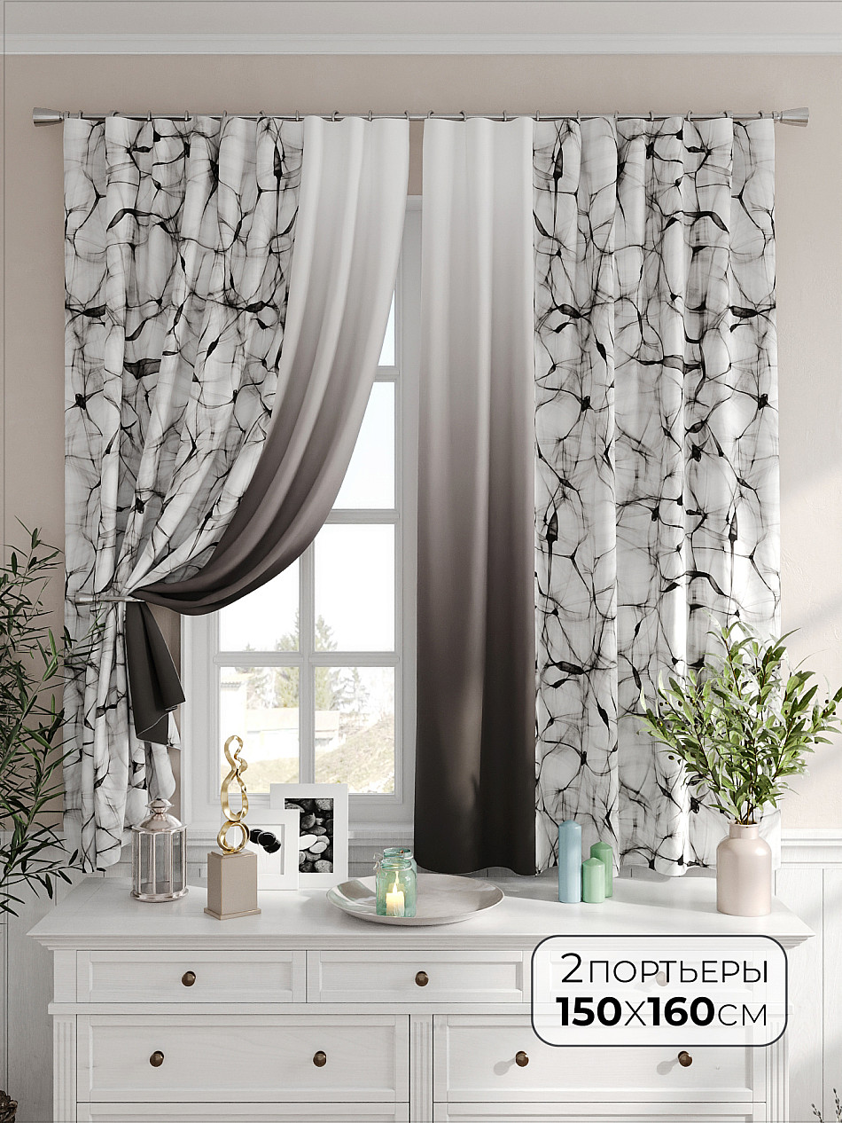 Портьеры 2 шт. Комплект штор из легкой портьерной ткани (габардин) оформлен печатным рисунком. Печатный рисунок дает широкие возможности обновить интерьер фактически не требуя ремонта за счет огромного выбора. Ткани с печатным рисунком безопасны и не содержат токсичных веществ. Не смотря на то, что материал легкий, он имеет высокую плотность, мало загрязнятся и не требует особого ухода даже после стирки, что важно для кухонных занавесок. Шторы не выцветают, не растягиваются, превосходно драпируются, образуя струящиеся складки. Прекрасное решение для создания красоты и уюта с помощью уникальных дизайнов.