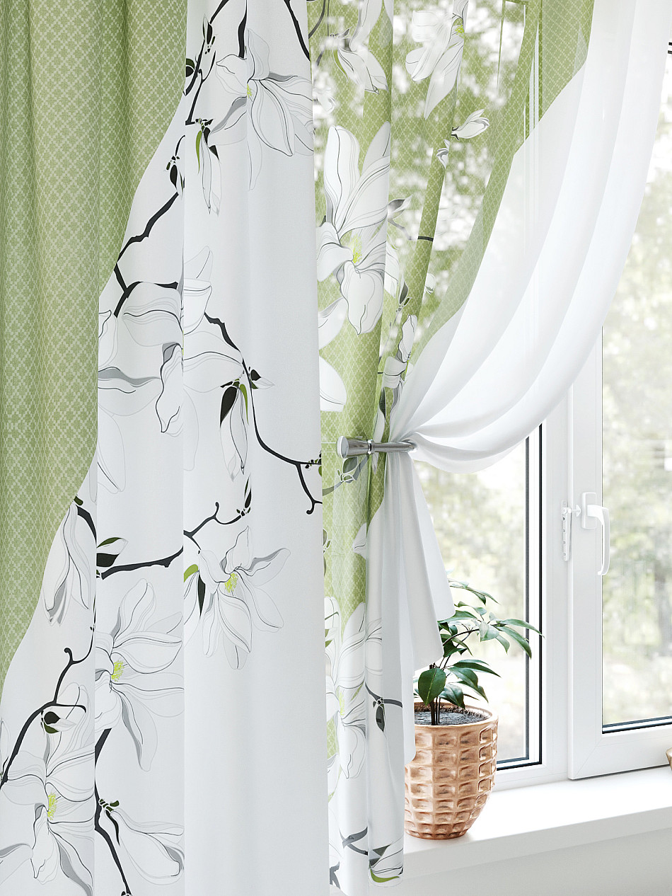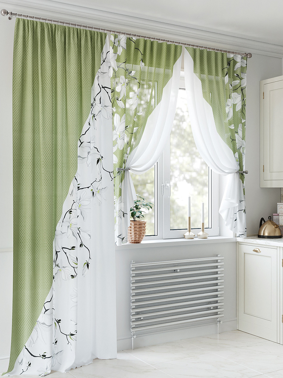 Портьера 150х270 см — 1 шт., вуаль 150х180 см — 2 шт. ( Уменьшить высоту ) Крепление: шторная лента (крючки), кулиска Подробнее