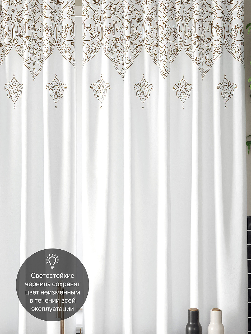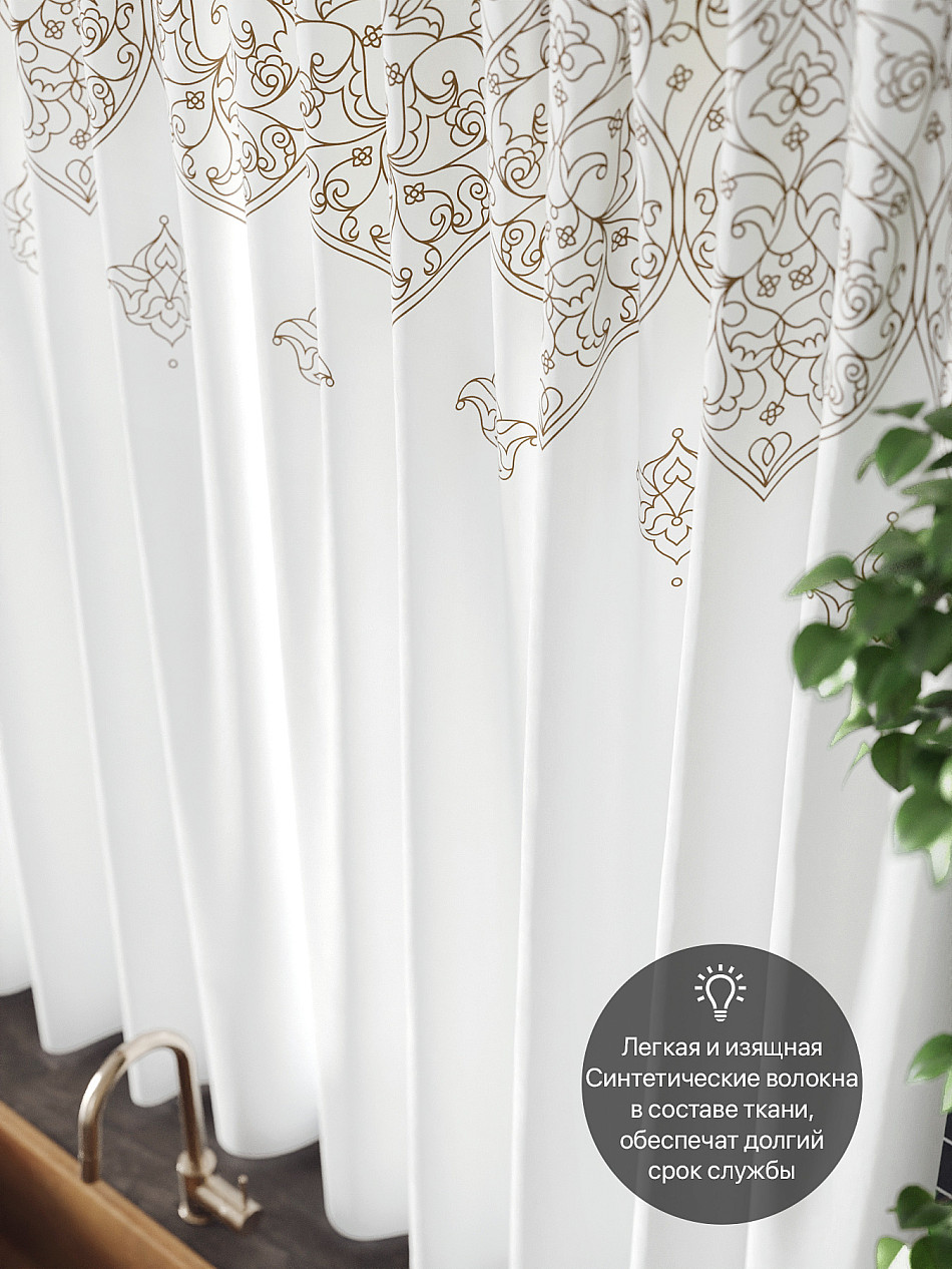 Комплект штор из легкой портьерной ткани (габардин) оформлен печатным рисунком. Печатный рисунок дает широкие возможности обновить интерьер фактически нет требуя ремонта за счет огромного выбора. Ткани с печатным рисунком безопасны и не содержат токсичных веществ. Не смотря на то что, материал легкий, он имеет высокую плотность, мало загрязнятся и не требует особого ухода даже после стирки, что важно для кухонных занавесок. Шторы не выцветают, не растягиваются, превосходно драпируются, образуя струящиеся складки. Прекрасное решение для создания красоты и уюта с помощью уникальных дизайнов.