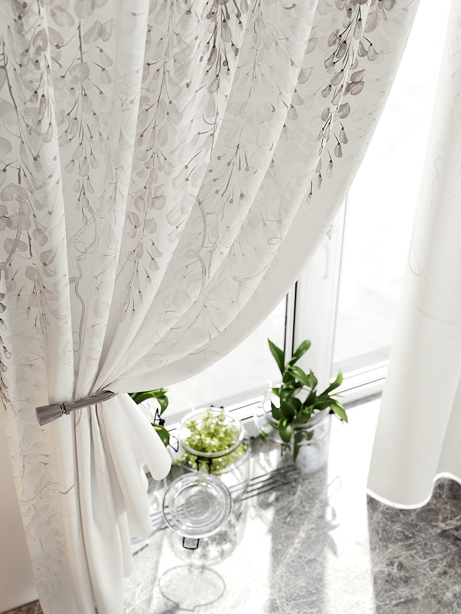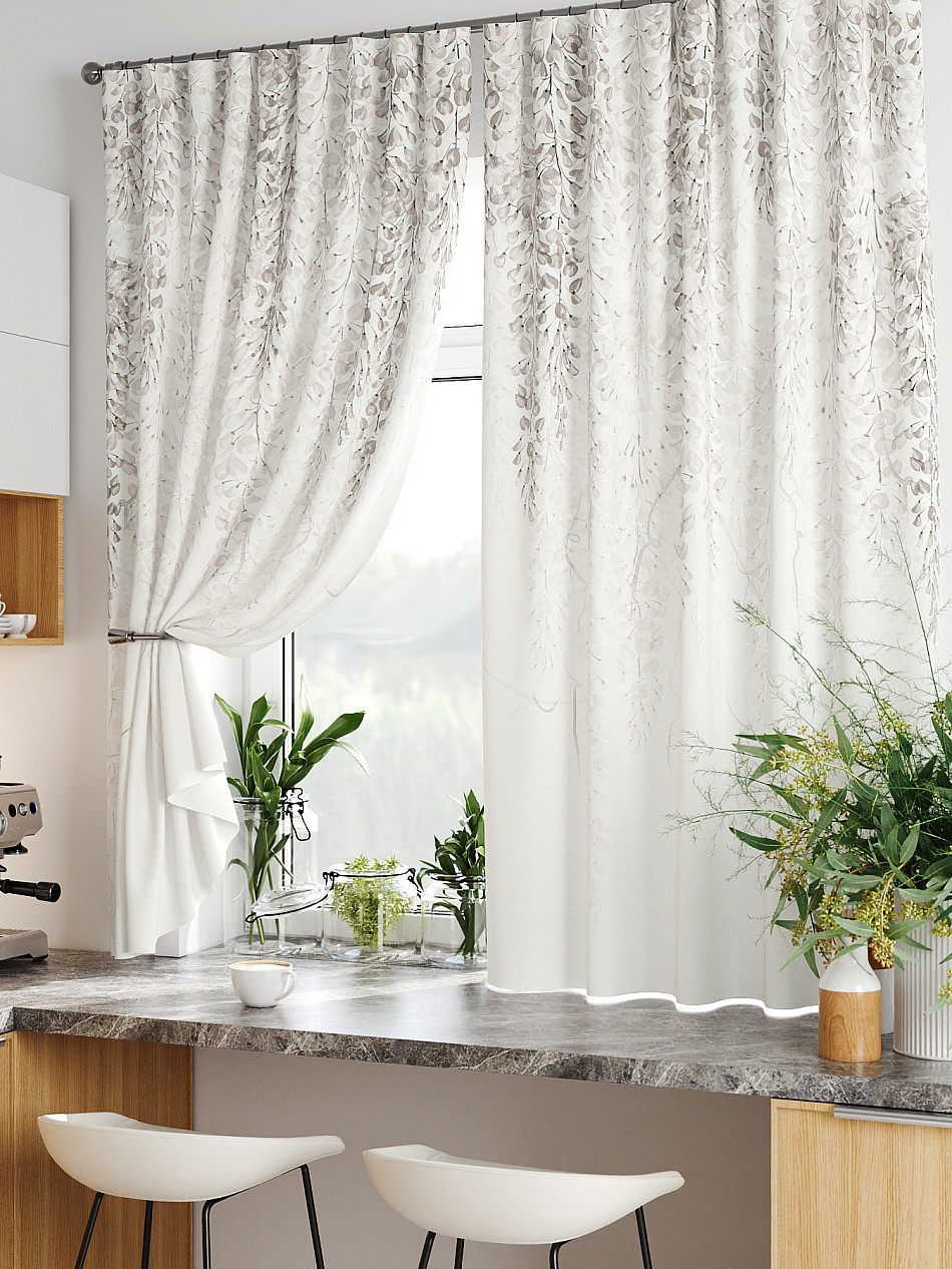 Комплект штор из легкой портьерной ткани (габардин) оформлен печатным рисунком. Печатный рисунок дает широкие возможности обновить интерьер фактически нет требуя ремонта за счет огромного выбора. Ткани с печатным рисунком безопасны и не содержат токсичных веществ. Не смотря на то что, материал легкий, он имеет высокую плотность, мало загрязнятся и не требует особого ухода даже после стирки, что важно для кухонных занавесок. Шторы не выцветают, не растягиваются, превосходно драпируются, образуя струящиеся складки. Прекрасное решение для создания красоты и уюта с помощью уникальных дизайнов.