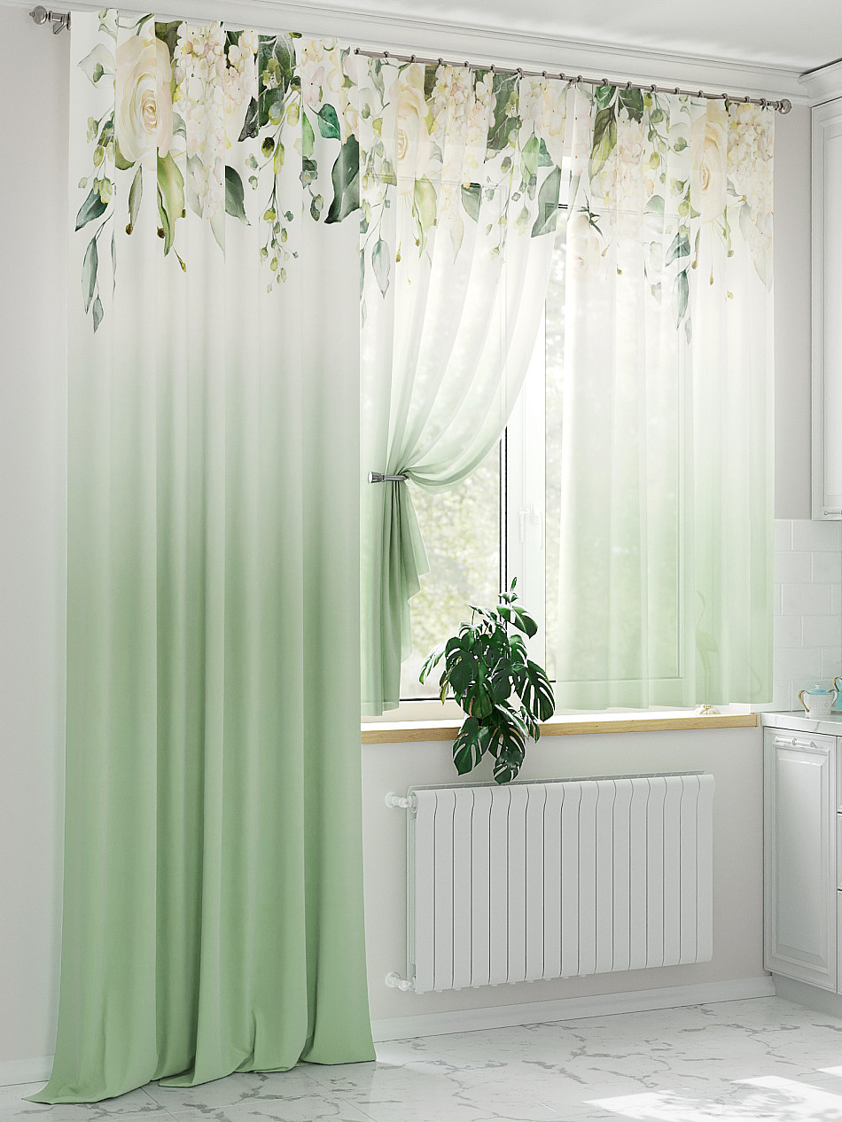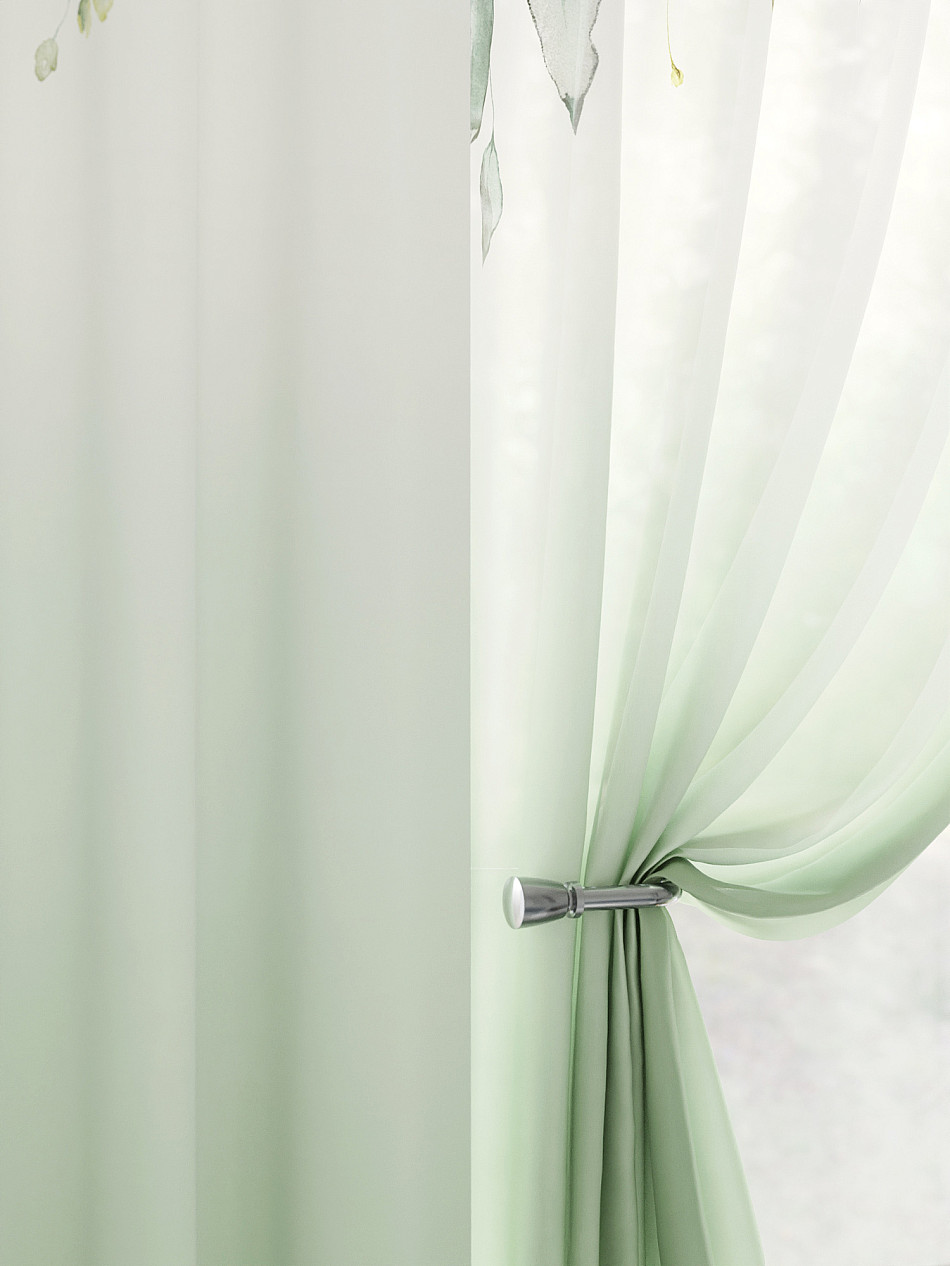Тюль 2 шт.: Легкая основа (вуаль) оформлена флористическим рисунком. Ширина — 150 см., высота — 180 см., крепление — шторная лента (крючки).