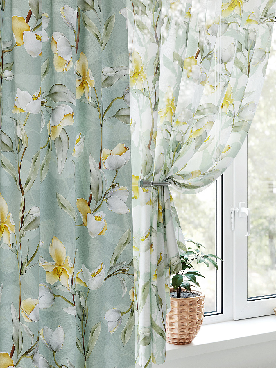 Тюль 2 шт.: Легкая основа (вуаль) оформлена флористическим рисунком. Ширина — 150 см., высота — 180 см., крепление — шторная лента (крючки).