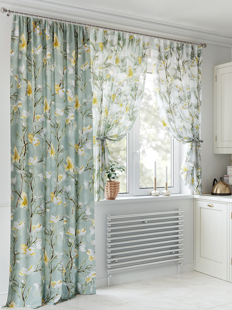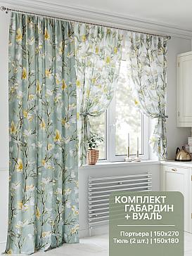 Портьера 150х270 см — 1 шт., вуаль 150х180 см — 2 шт. ( Уменьшить высоту ) Крепление: шторная лента (крючки), кулиска Подробнее